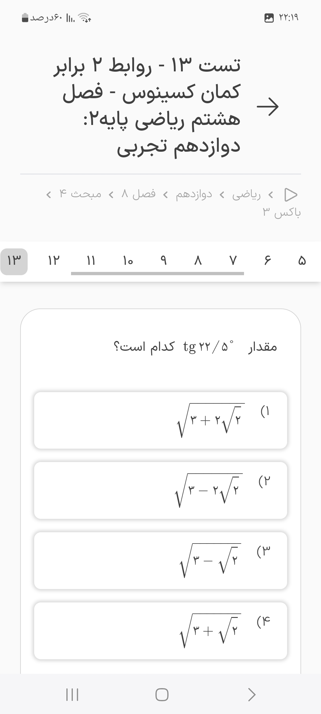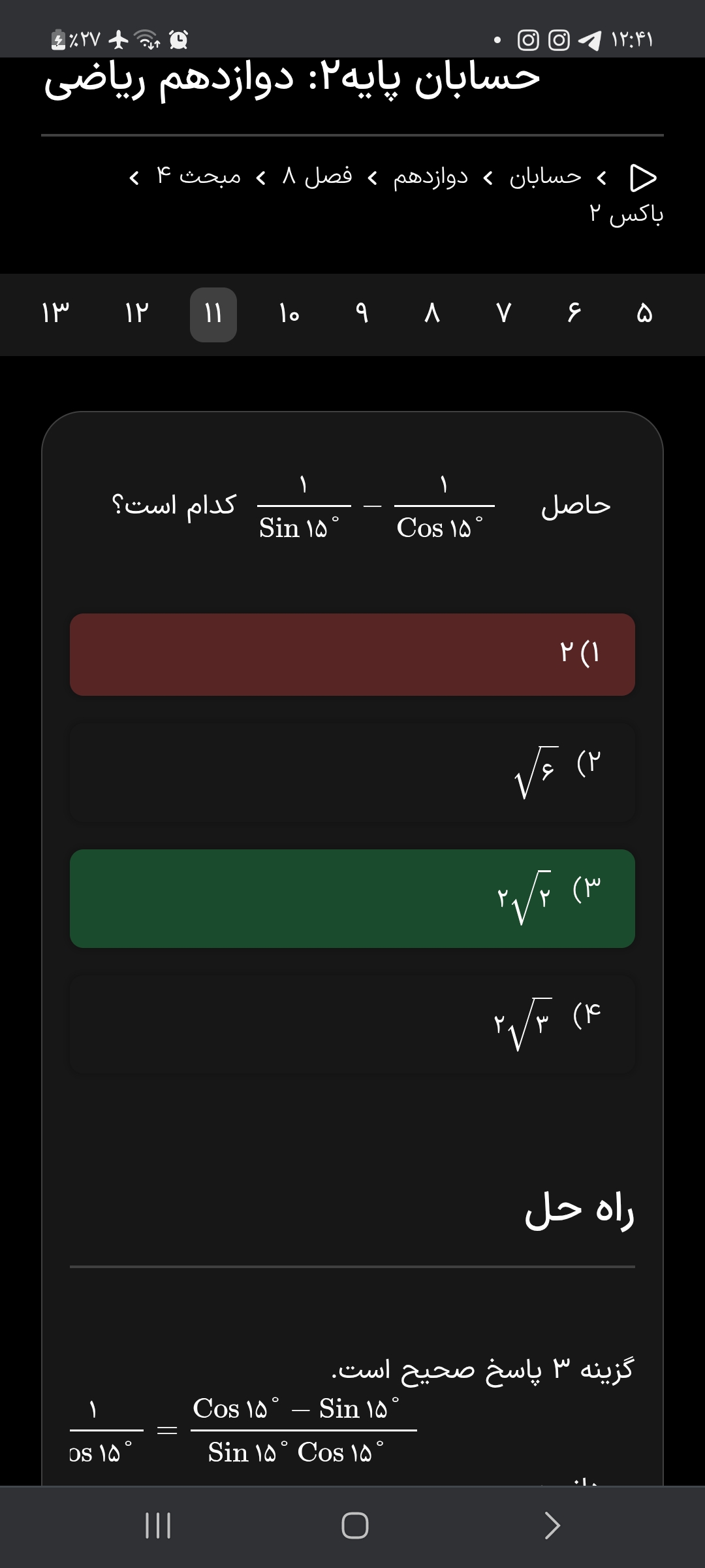سلام دو عبارت اتحاد مزدوج دارن پس اونها رو به صورت مزدوج در هم ضرب می کنیم از طرفی از مثلاث دوازدهم می دونیم که کوسینوس دوبرابر یه زاویه ای برابر میشه با فرمولی که شما از اتحاد بدست اوردین پس در واقع اینجا نیاز هست شما کوسینوس ۳۰ رو بدست بیارین