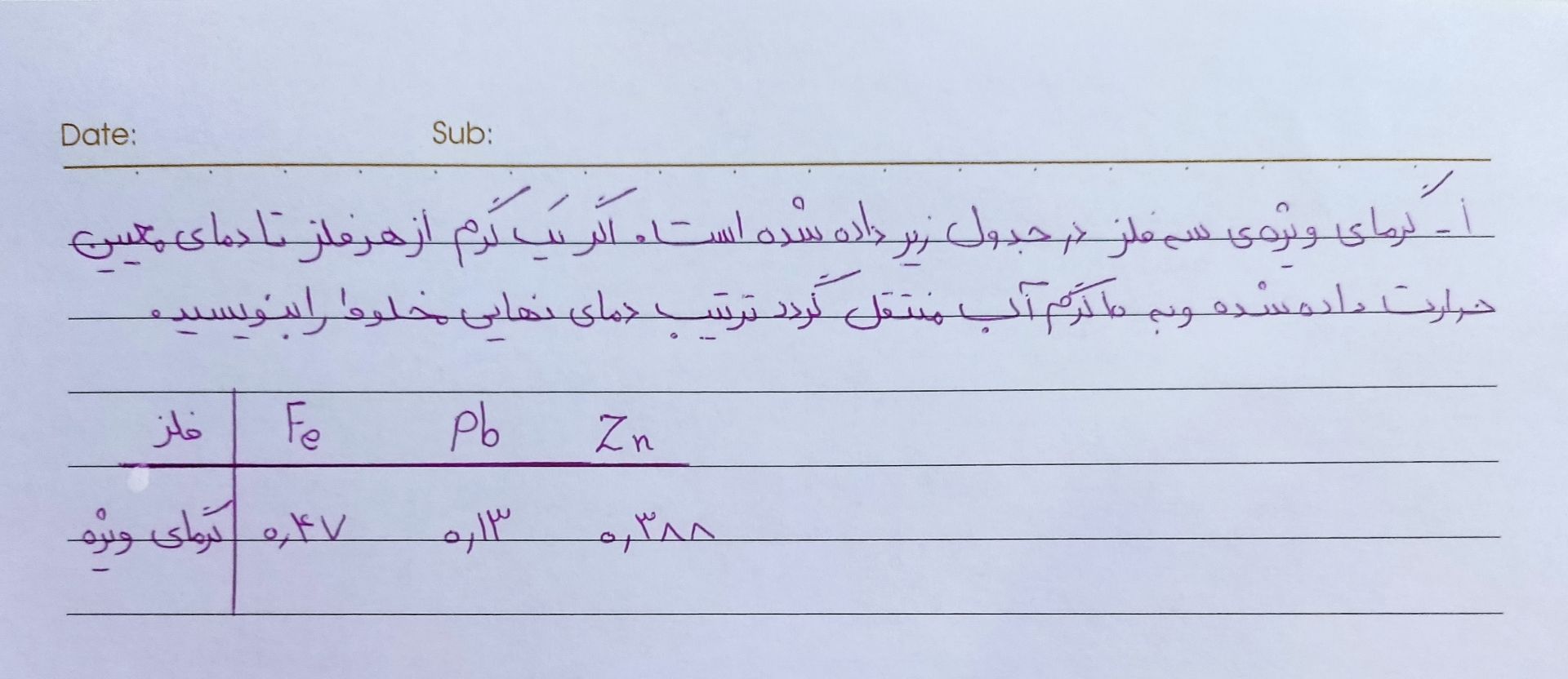سلام ببین گرمای ویژه کلن تعریفش اینه که اون جسم مد نظر شما،هر یک گرمش به ازای هر یک درجه سلسیوس تغییر دمایی که بخواد داشته باشه،چقدر انرژی گرمایی میگیره یا از دست میده حالا متن سوال گفته یک گرم از هر کدوم رو تا یه دمایی گرم کنیم و سپس اون گرمایی که هر کدومشون جذب کردن رو بدیم به آب حالا اونی که گرمای ویژه بیشتری داره،قطعا گرمای بیشتری جذب یا دفع کرده و در نتیجه،دمای مخلوط نهایی رو بالاتر میبره (یعنی به ترتیب اول Fe بعدش Zn بعدش Pb) اگر ویس ناواضح بود بگید دوباره ضبط کنم ریپلای نکنید 🌷