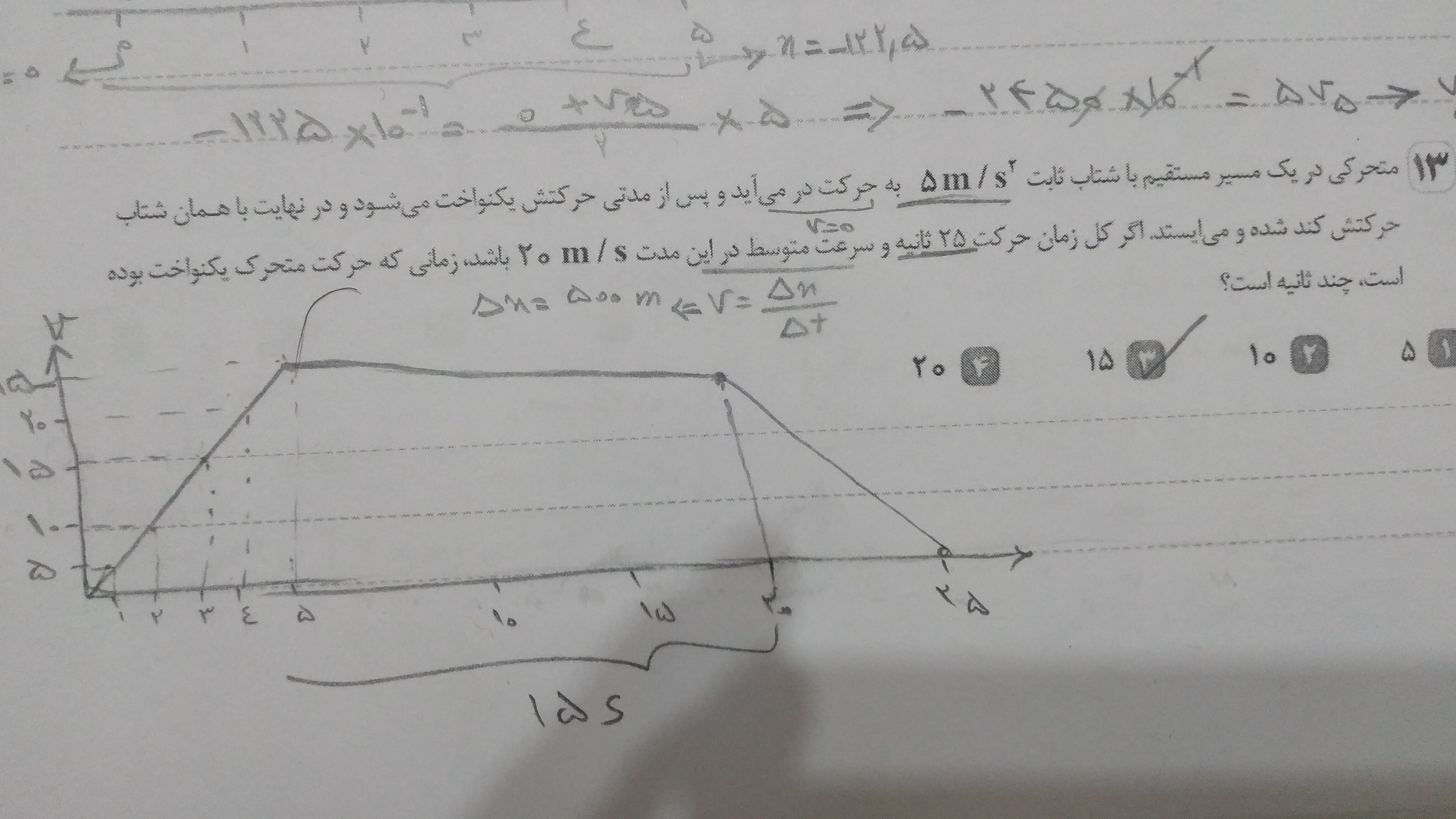 سلام من اومدم سرعت اولیه را بدست آوردم شد ۴۰ بعد گفتم که مگه نگفته آخر کار سرعت به صفر می رسه باشتاب منفی ۵ پس یعنی ۴۰ تقسیم بر ۵ میشه ۸ یعنی ۸ ثانیه حداقل برای ایستادن نیاز داریم بهد ۲۵(زمان کل )منهای ۸میشه۱۷ ۲انیه برامون میمونه بهد آمدم گفتم اگه اول و آخر ۱ ثانیه نمیشه ۲ ثانیه میشه ۳ثانیه نه و ... که همون ۲ ثانیه میشه پس جواب میشه ۱۵ این راه درسته ؟؟؟؟؟؟؟؟