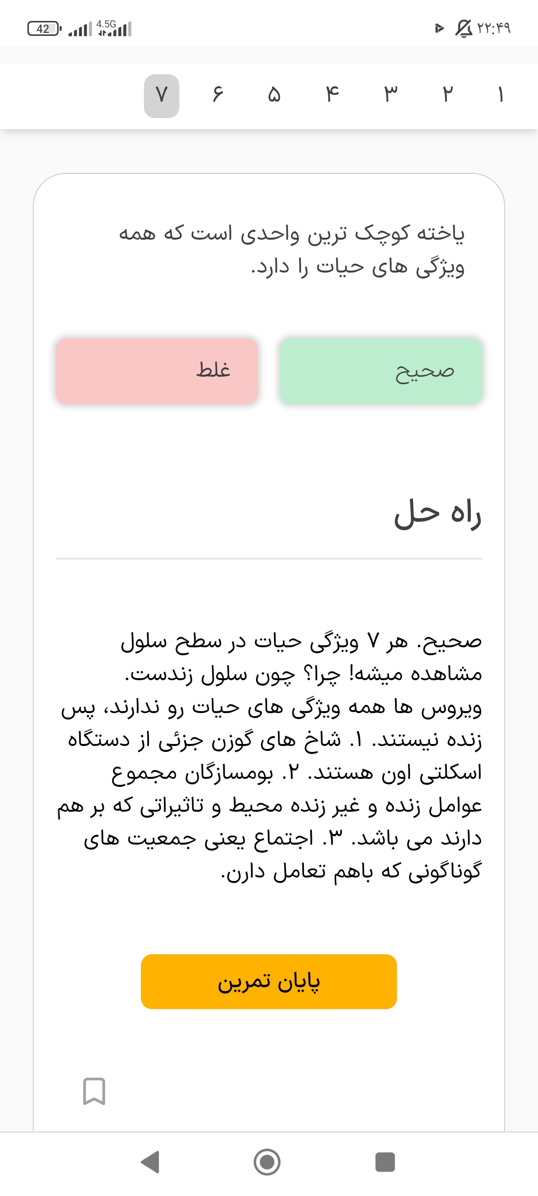 سلام توی این قسمت چرا جواب صحیح میشه؟ برای مثال اگه ما یک ساخته رو از بدن خارج کنیم تا چند دقیقه شاید زنده بمونه اما بازم با این حال زنده میشه؟ چون اگه هفت ویژگی رو داشته باشه جاندار به حساب میاد و ما گفتیم فقط تک سلولی ها جاندار هستند