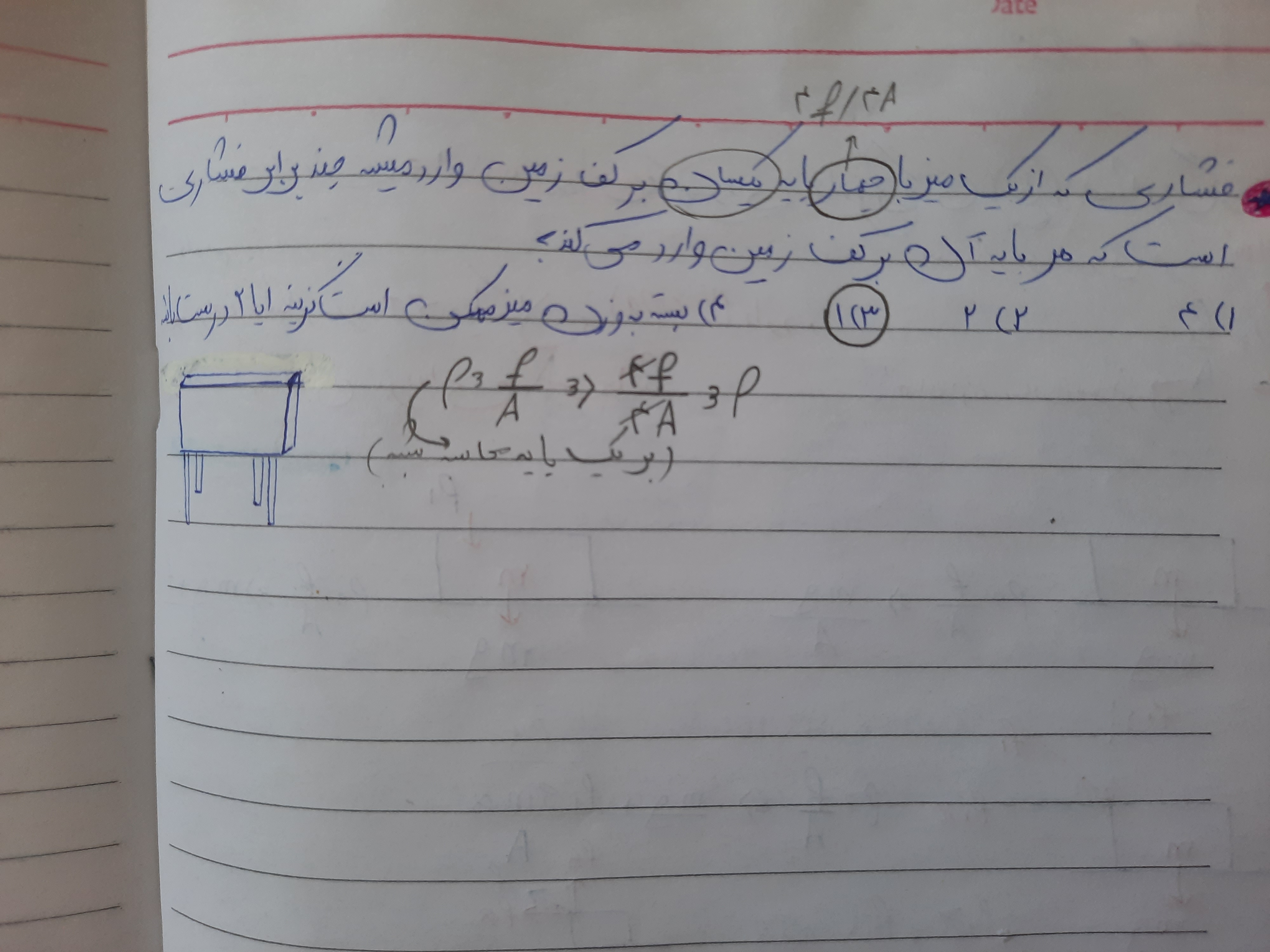 @سید محمد متین رشادی خب تو سوال نگفته که نیرو وارد بر میزو به چهار قسمت تقسیم کنیم و فشاری که هر پایه وارد میکنه میشه همون mg بر روی مساحت پایه،از طرفی فشاری که میز وارد میکنه برابره با همون mg عه ولی تقسیم بر ۴تا از مساحت پایه که اگه اینطوری حلش کنیم جواب کسری میشه:۱/۴(یک چهارم) :/:/:/:/