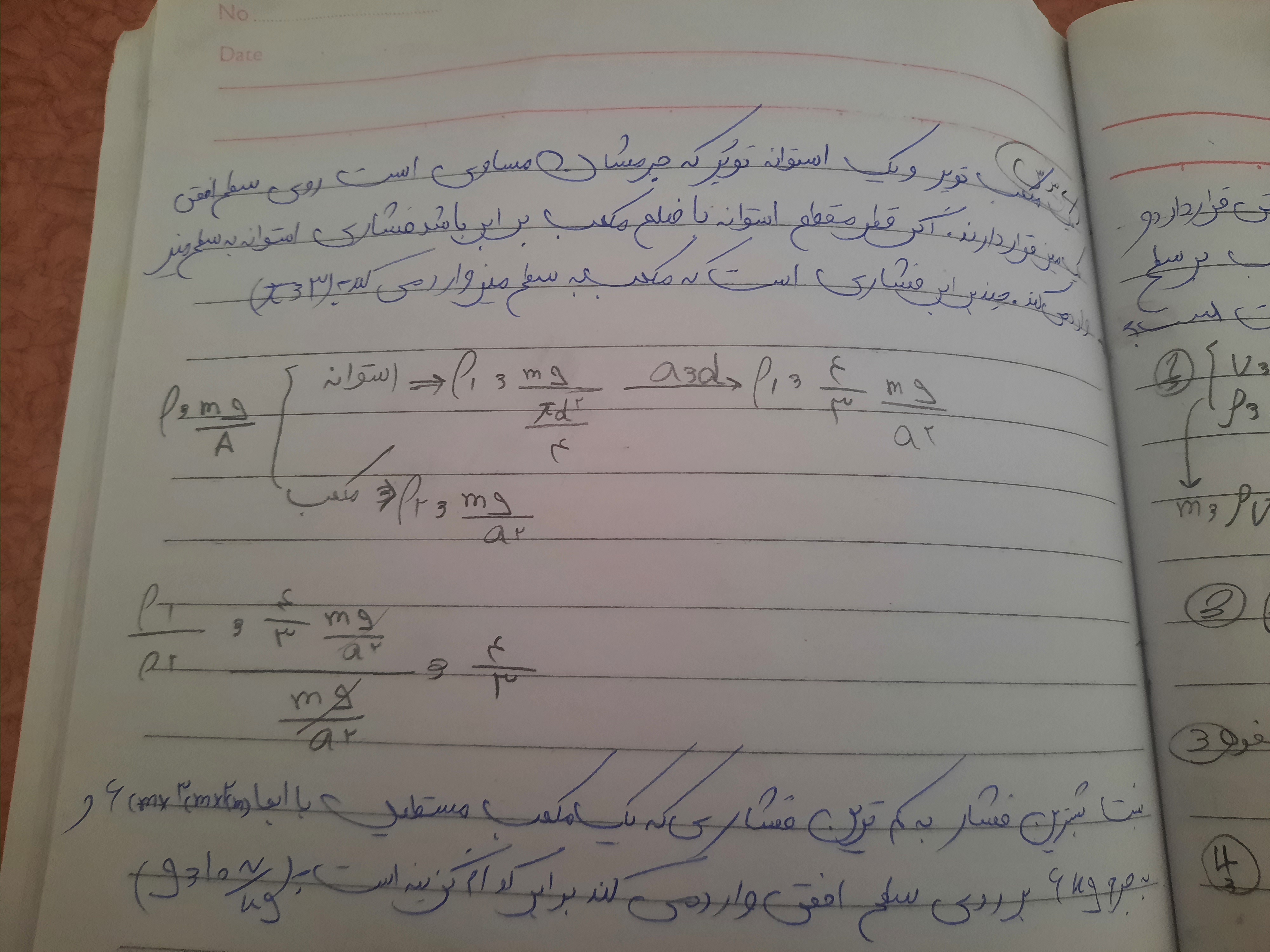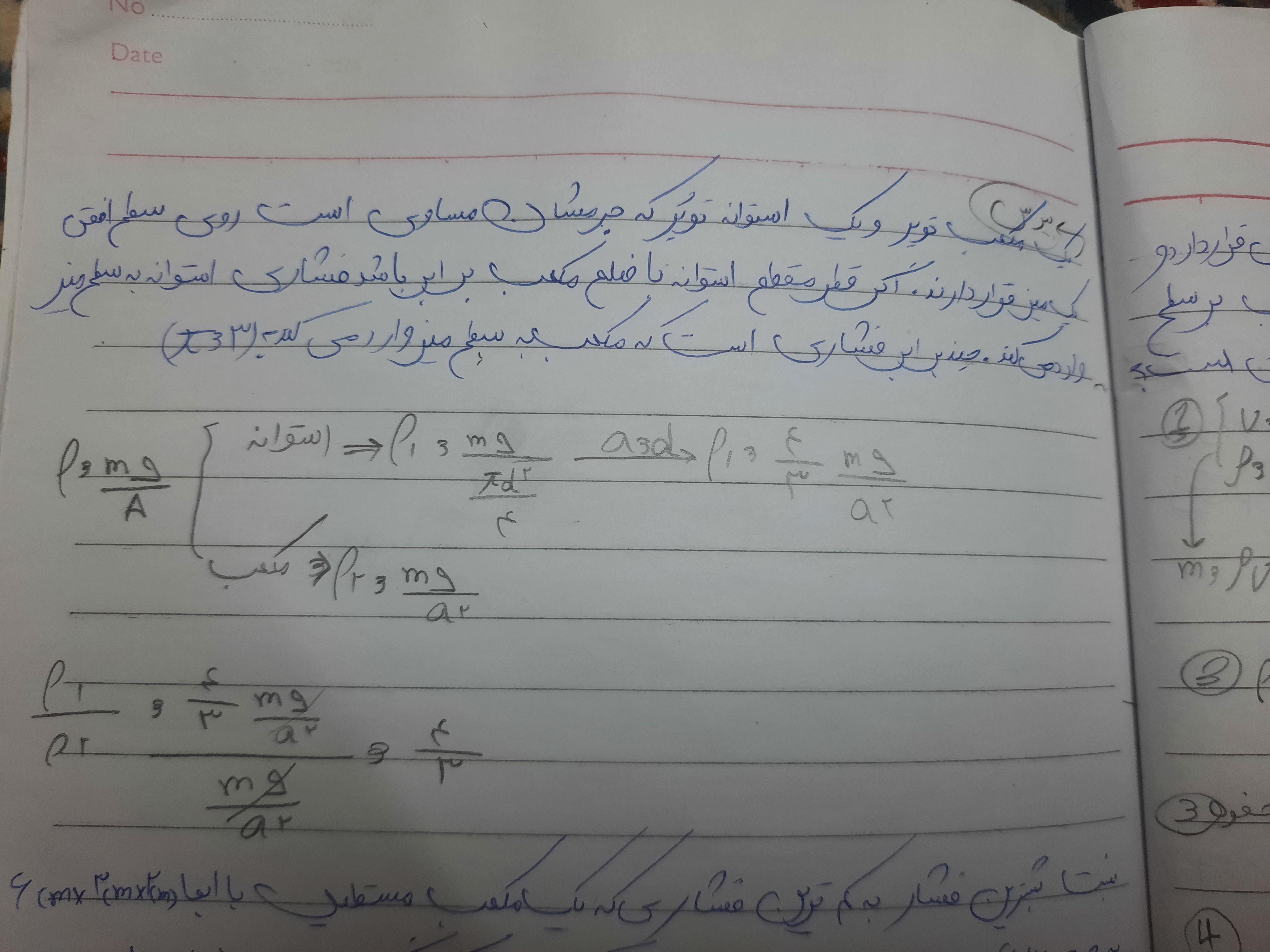 سلام. وقتتون بخیر باشه. من قسمتی رو که استاد توی این تست فشاری که از طرف مکعب به استوانه وارد میشه رو به دست آوردند متوجه نشدم. در اولین مثال صفحه 49 جزوه این فصل وقتی که میخواستیم فشاری که مکعب مستطیل بر سطح بالایی مخروط وارد میکنه رو محاسبه کنیم در مخرج کسر فشار مساحت سطح بالایی مخروط رو قرار دادیم نه مساحت کف مکعب مستطیل رو. پس چرا توی این سوال در مخرج کسر فشار مساحت کف مکعب رو قرار دادیم نه مساحت سطح بالایی استوانه رو؟