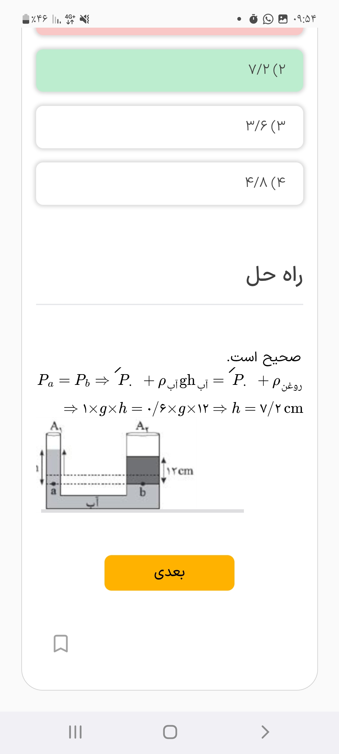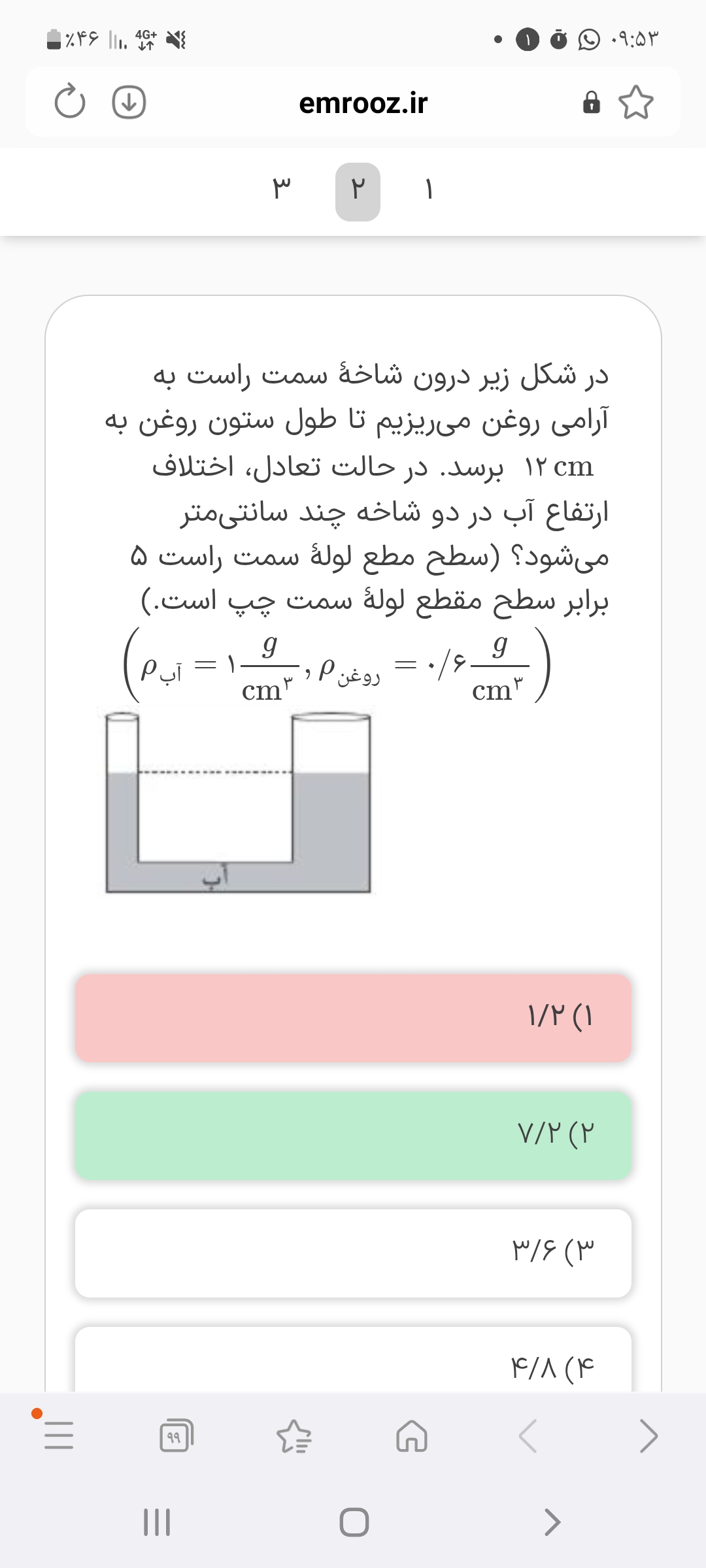 سلام جواب میشه گزینه۱ چون گفته جیوه چقد میره بالا که منظور لوله سمت چپه و چون سطح مقطع لوله سمت راست۴پس جیوه به اندازه۴xمیره بالا شما فک کنم فشار رو حساب کردین