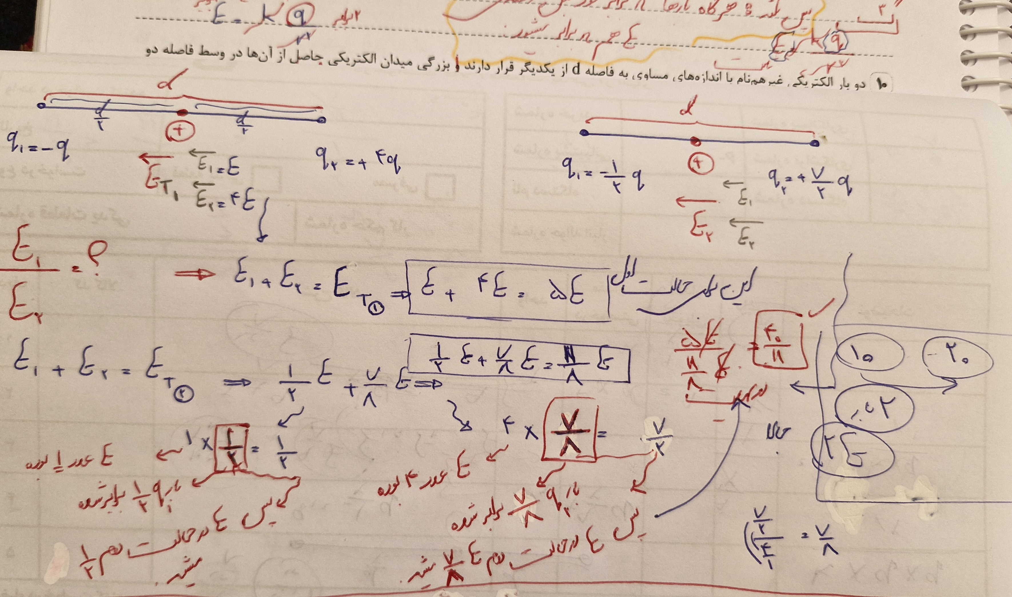 من وقتی خودم سوالو حل کردم q دو رو حذف نکردم فقط چون گفته بود خنثی توی اوایل فصل گفتیم که وقتی یه بار خنثی باشه و یه بار باردار همدیگرو جذب میکنند پس E۲ هم میشه به سمت راست.... چرا استادq۲را حذف کرد