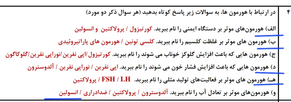 سلام وقتتون بخیر ممنون میشم این سوالمو جواب بدید علاوه بر هورمونهای ذکرشده میتونیم هورمونهایی که میگم رو هم بنویسیم؟ الف اپی نفرین و نوراپی نفرین (مثل کورتیزول) ب هورمونهایی جنسی تستوسترون استیروژن پروژسترون د ضدادراری و کورتیزول ه هورمونهای جنسی تستوسترون استیروژن پروژسترون و اینکه در قسمت( و )انسولین چطوری باعث حفظ تعادل آب میشه