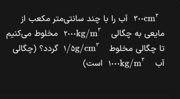 سلام وقت بخیر ، این تست یادبگیریم هست من جواب رو بدست اوردم شد ۱۵۰، شمام بدست بیارید میشه ۱۵۰ بعدش اومد گفت چون چگالی مخلوط میانگین چگالی آب و مایع بوده پس حجمشونم برابره ، حجم آبم داده بود تو صورت سوال 300 ، پس جواب شد 300 .. الان من سوالم اینه ، آیا این میتونه ی نکته باشه که اگه چگالی مخلوط میانگین چگالی (مثلا) آب و مایع باشه پس حجم ها برابر هست . حالا ی سوال دیگه اگه جوابتون بله هست،پس ما با فرمول اصلی به جواب نمیرسیم در اینجور سوالا ؟ 🤨