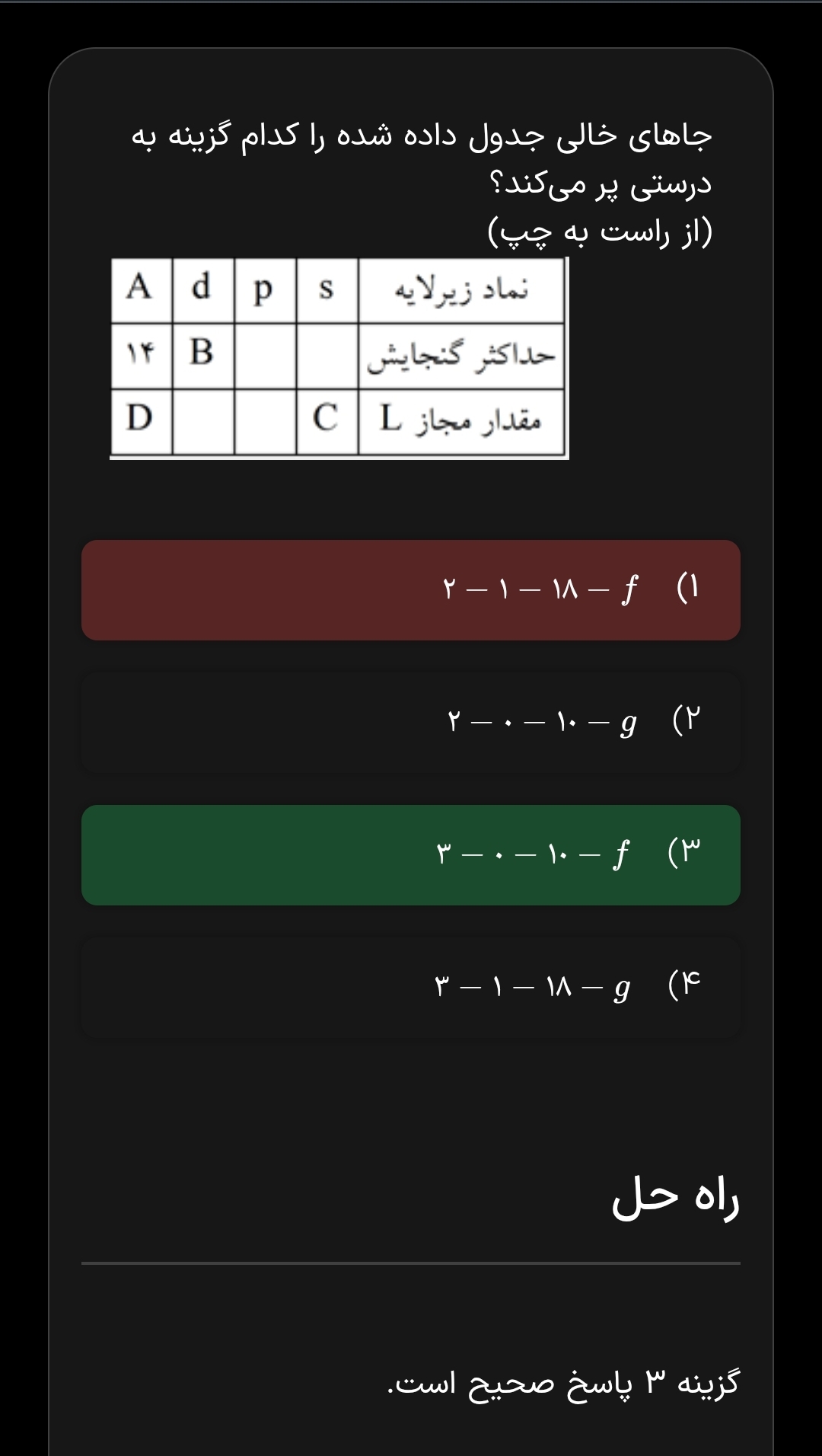 سلام برای گزینه سوم میتونیم از یه زاویه ی دیگه بهش نگاه کنیم که غلط بشه حسابش کرد؟ من این گزینه سوم و اشتباه گرفتم چون که این فرمول ظرفیت گنجایش الکترونی در (یک زیرلایه )رو مشخص میکنه نه (زیر لایه ها )