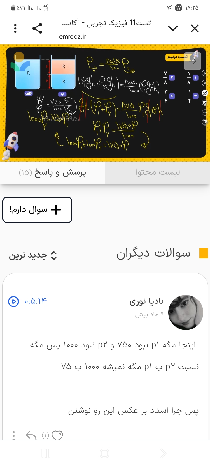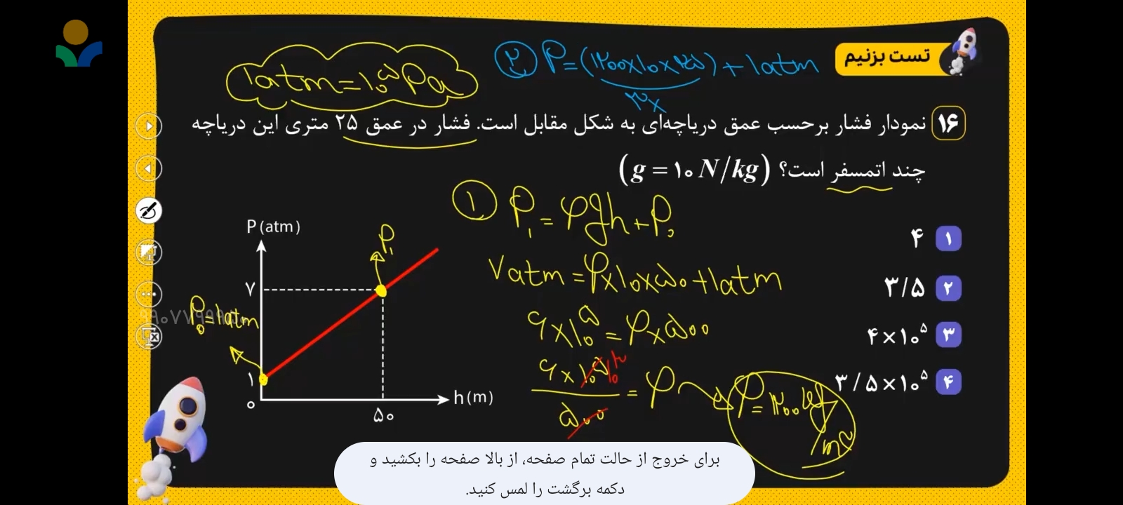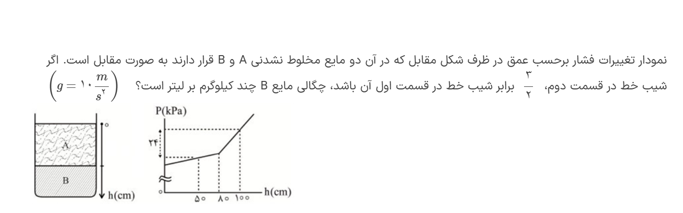 این سوال رو نمیشه به جای نوشتن نسبت pB/pA بگیم چون فشار B برابر است با فشار A به اضافه فشاری که اون پنجاه سانتی متر وارد میکنه اینجوری نویسیم pA+pgh/pA من اونجوری رفتم جواب اشتباه اومد