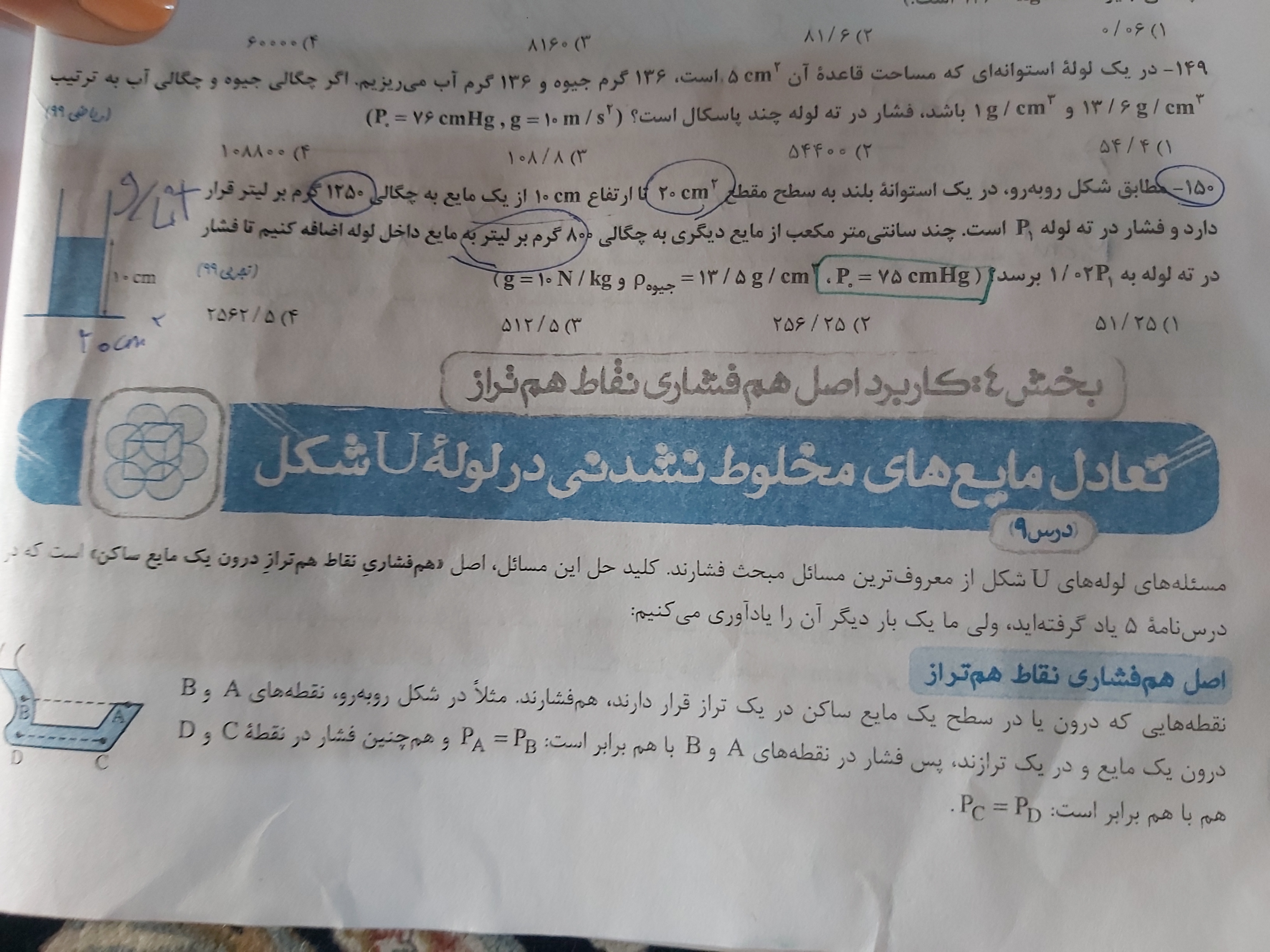 سلام. من حساب نکردم اینی که گفتی رو ولی اگر اینجوری باشه دیگه لازم نیست بیایم حجم هرکدوم رو جداگانه حساب کنیم چون یه مایعه و حجم کلش رو هم به ما داده و اگر حساب کنیم اینو میشه ۳۲ که اشتباه درمیاد. و اینم بگم که ما تو فرمول f=pa سطح مقطع پایینی رو درنظر میگیریم ولی تو فرمول v=ah برای هر کدوم یه سطح مقطع جداگانه باید در نظر بگیریم و این جور در نمیاد.