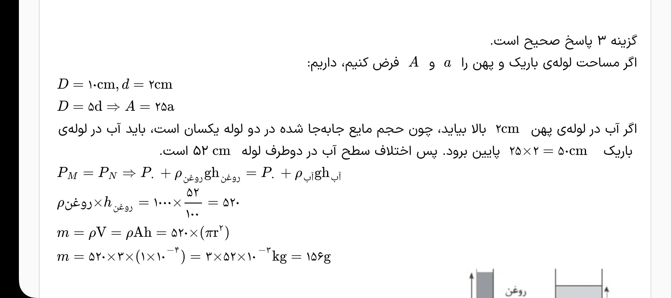 میتونیم اینطوری بگیم که توی سمتی که سطح مقطع بیشتره چون سطح مقطع با فشار رابطه ی عکس داره و هرچه سطح مقطع بیشتر باشه فشار کمتری از سوی جرم وارد میشه پس اینجا چون فشار کناری وارد میشه مایع کمتر میاد پایین پش ارتفاعش بیشتره؟