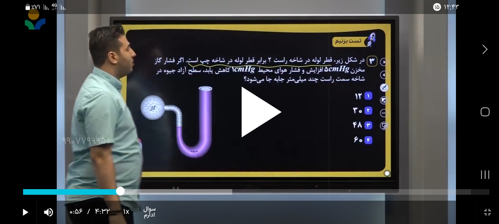 سلام وقت بخیر من یک چیزهایی را از این تست نمیفهمم از جمله اینکه در دقیقه ۳:۱۵ این شکلی که کشیده شده اون بخش h که با رنگ قرمز مشخص شده چی هستش ما میدونیم که فشار از لوله سمت چپ چهار ایکس به پایین و از لوله سمت راست یک ایکس به بالا حرکت میکنه خوب پس h که مابین این ها قرار داره چیه و اینکه ما میدونیم به خاطر افزایش فشار مخزن و کاهش فشار هوا مایع ۶ سانتی متر به سمت پایین حرکت میکنه پس یعنی ۴ ایکس مساوی است با شیش اما اینجا گفته شده که پنج ایکس مساوی هست با شیش میشه بگید چرا