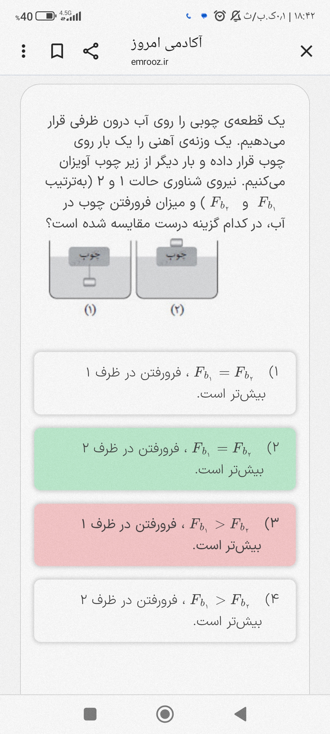 کل نیروی شناوری که در هردو شکل یکسانه چون در هردو شکل همون چوب و همون وزنه است . اگر میگفت نیروی شناوری وارد بر چوب باز فرق می کرد جواب. در مورد فرو رفتن هم در شکل ۲ چون وزنه تو آب نیست که بخشی از نیروی وزنش توسط آب خنثی بشه فشار بیشتری به پایین وارد میکنه. اساتید اگر اشتباه گفتم تصحیح بفرمایید