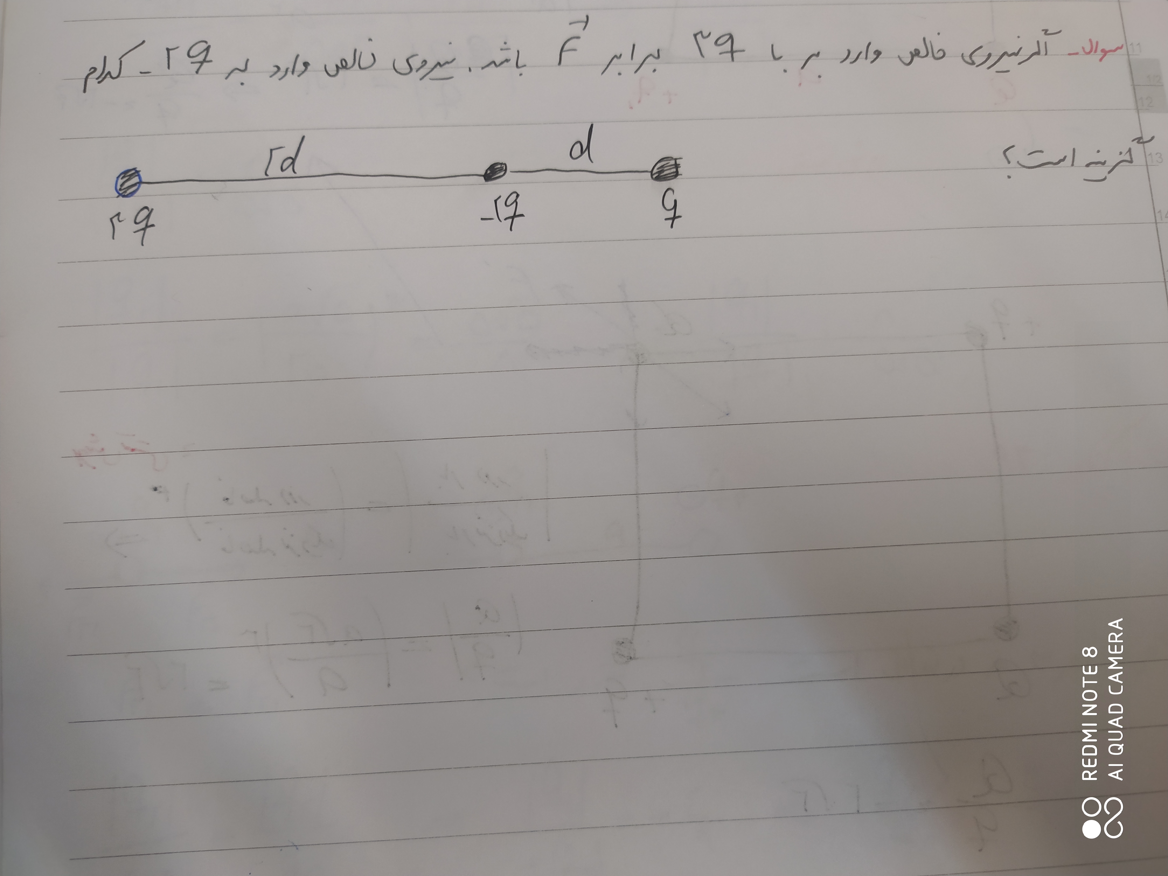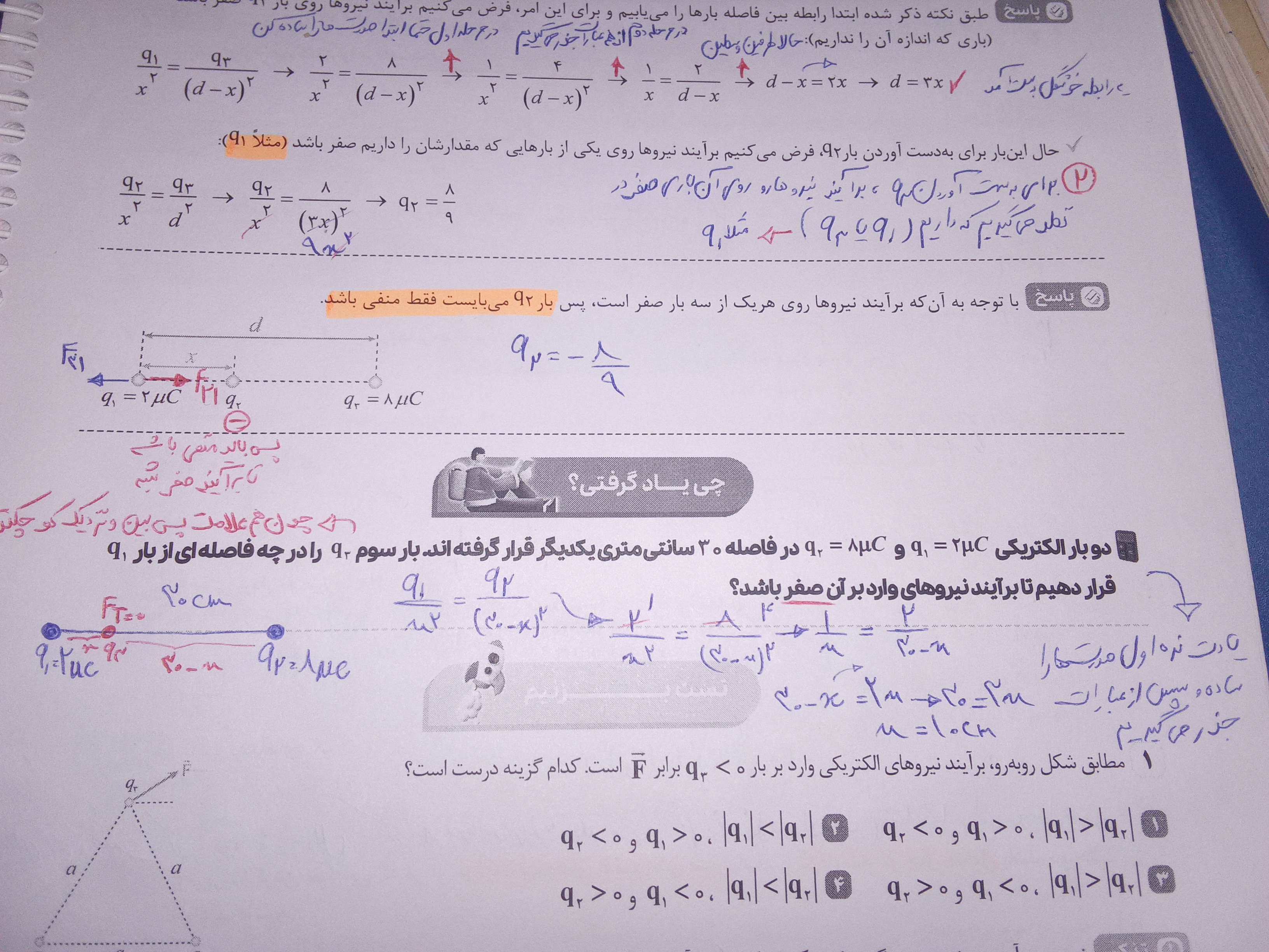 سلام وقتتون بخیر تو هفتمین سوال که ذره ها روی محور بود من از روش ۹۰ نرفتم تبدیل واحد انجام دادم جواب F31=۰۰/۴ بدست اومد چون ۱۰ به توان ۹ با ۱۰ q1 میشه ۱۰ به توان ۱۰ و با دوتا ۱۰ به توان ۶ جواب میشه ۱۰ به توان منفی دو که ضربدر ۴ میشه اشتباه انجام دادم ؟
