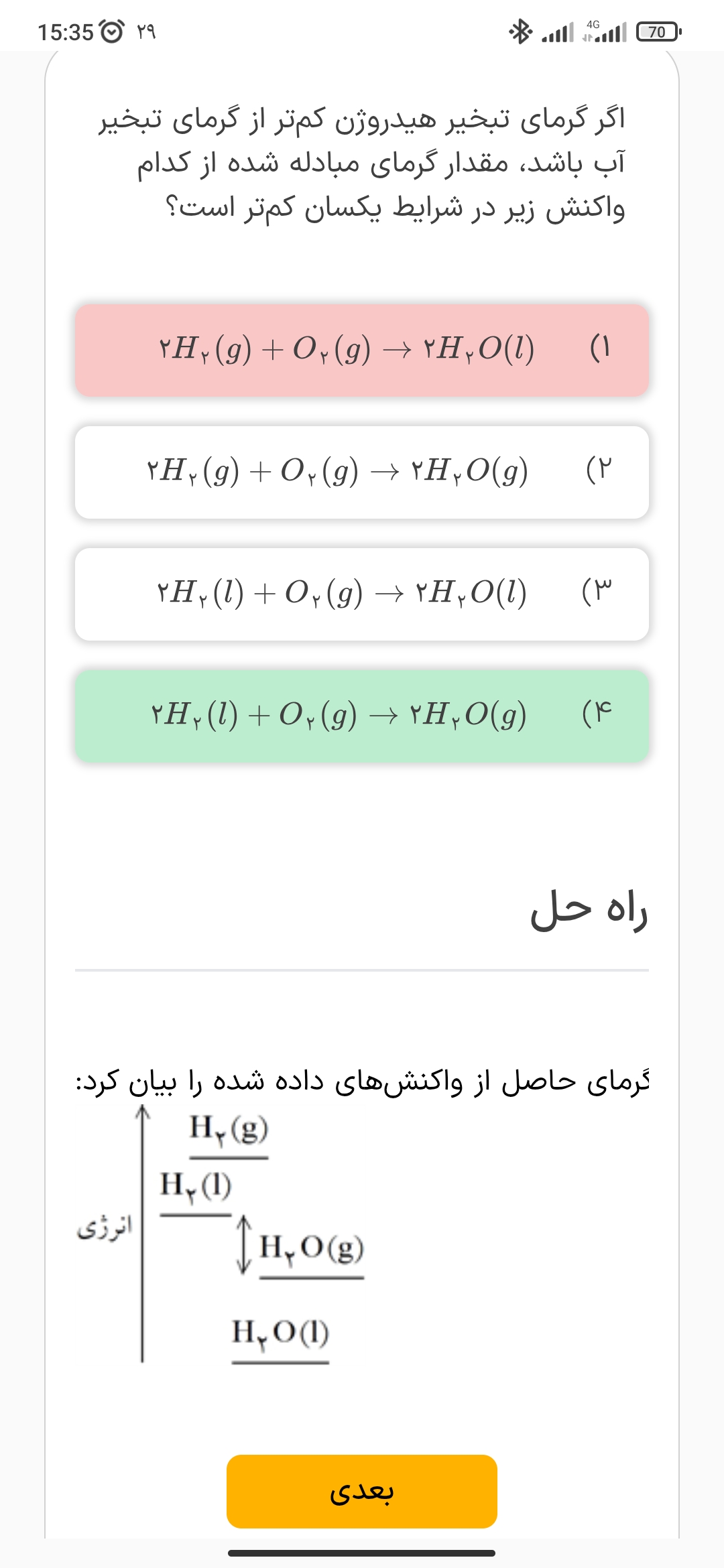 تمرین سوم جوابش گزینه یک میشه ولی استاد گفت گزینه دو چون واکنش دهنده باید ناپایدار باشه گاز و فراورده مایع باشه یعنی پایدار