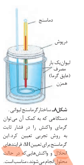 پس میشه گفت واسه واکنش هایی استفاده میکنیم گرماسنج رو که فاز ماده های واکنش دهنده و فراورده باید محلول باشن یا مایع پس یعنی اگه یکیشم جامد بود یا گاز نمیشه درسته؟
