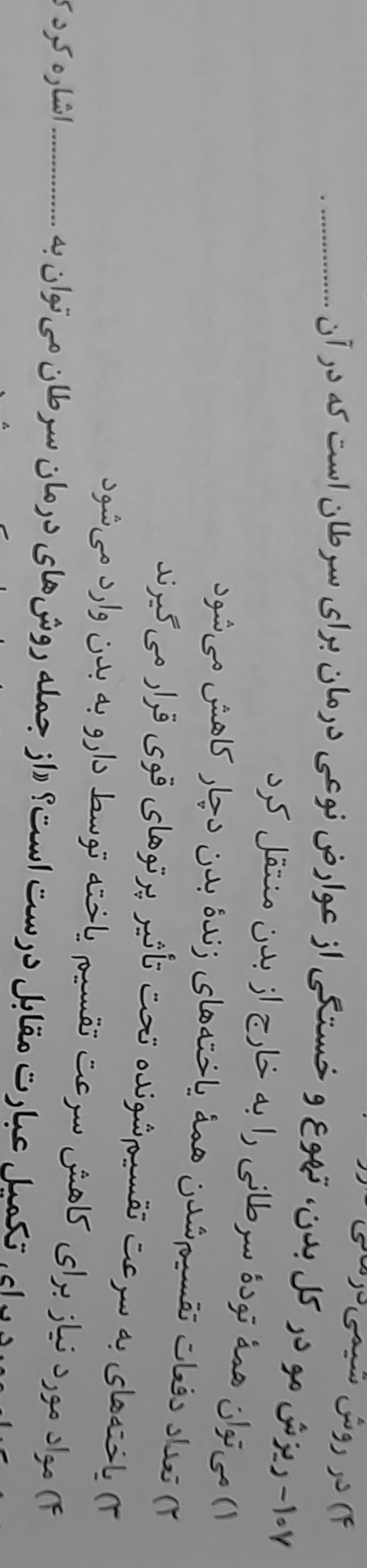 سلام ببخشید اینجا استاد این عوارض رو برای شیمی درمانی نوشتن و تو جزوه ما برای پرتو درمانی هم گفتن عوارضش هست ولی تو این تست اومد گفت فقط شیمی درمانی الان کدومو در نظرش بگیرم؟