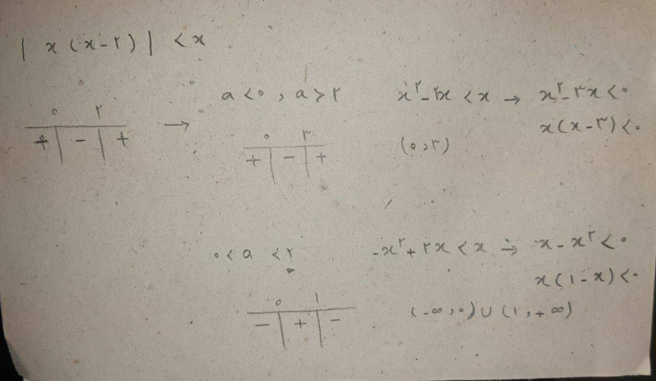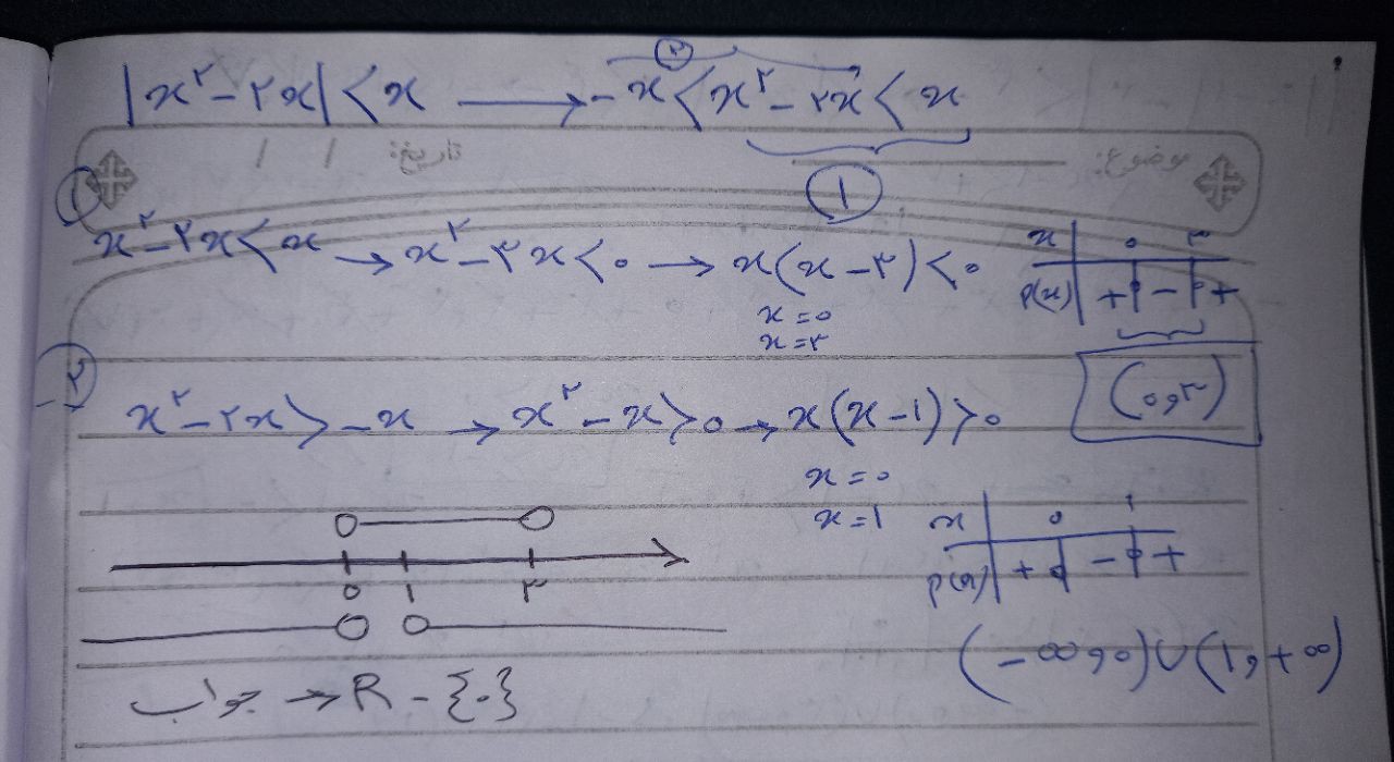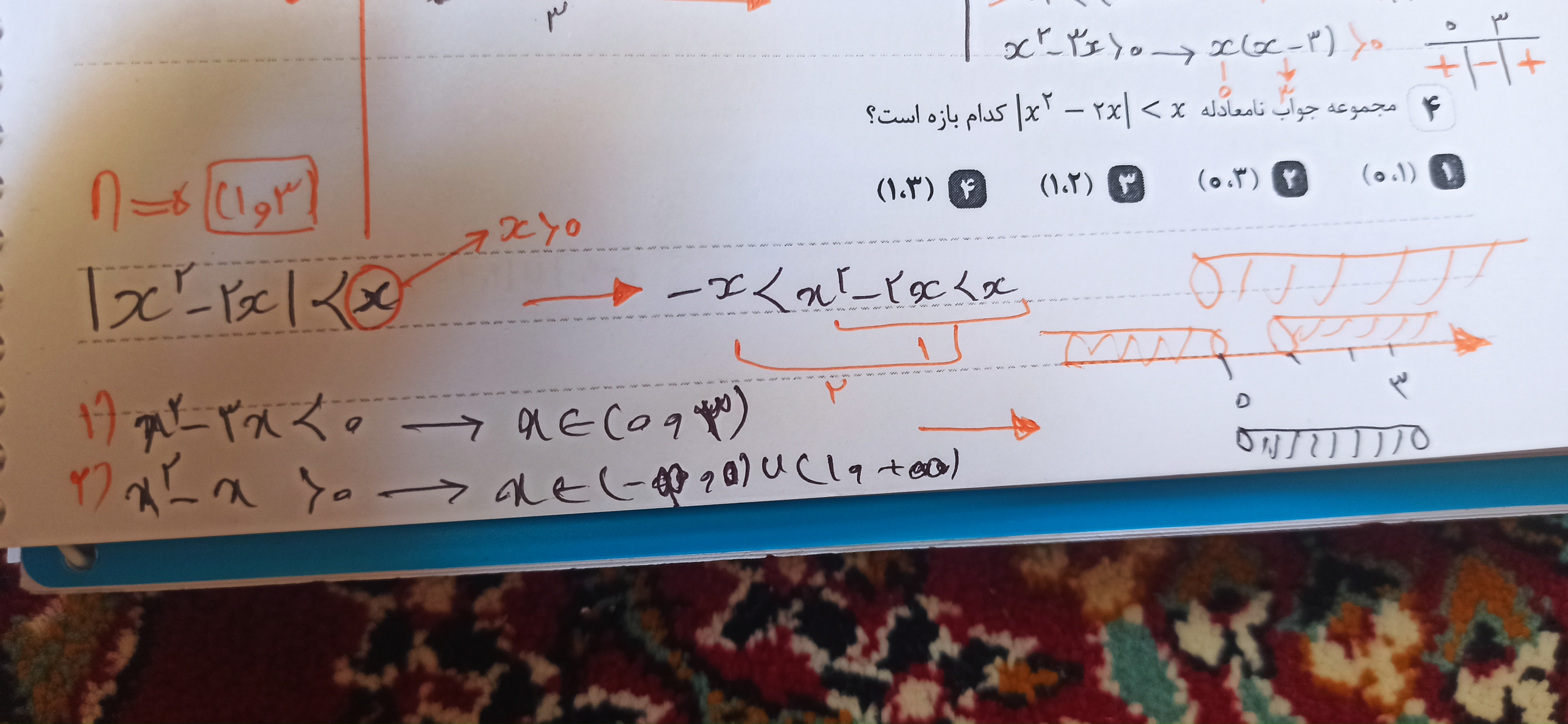 @محمدرضا نعمتی در اون قسمت انتهایی ،مگه خودتون نمیگید که بین جواب ها اجتماع و با شرط اشتراک میگیریم؟ مگه اجتماع جواب ها نمیشه Rبه جز صفر و خب اشتراکش با شرط میشه ایکس های بزرگتر از صفر