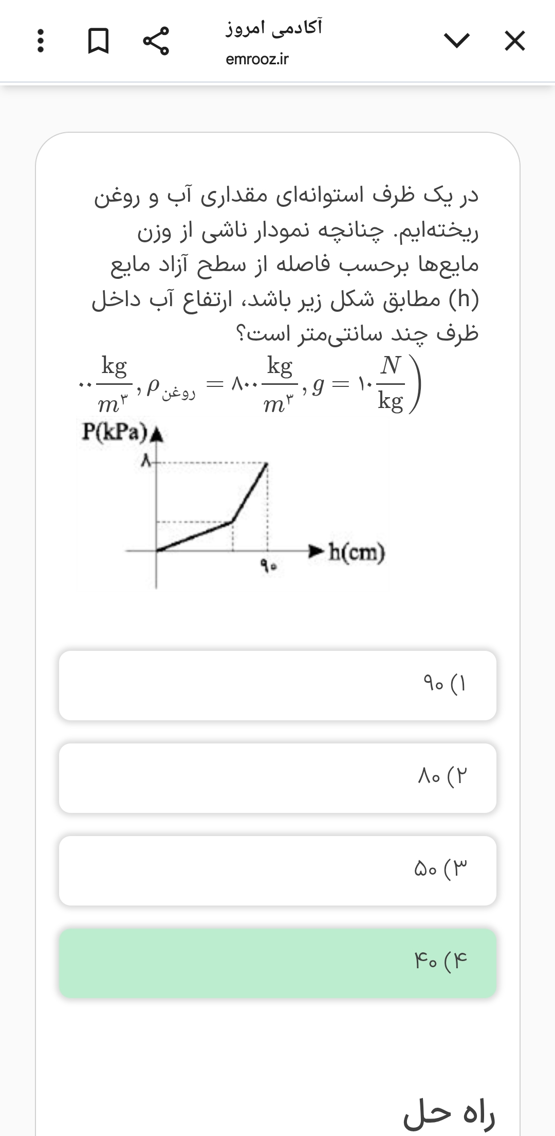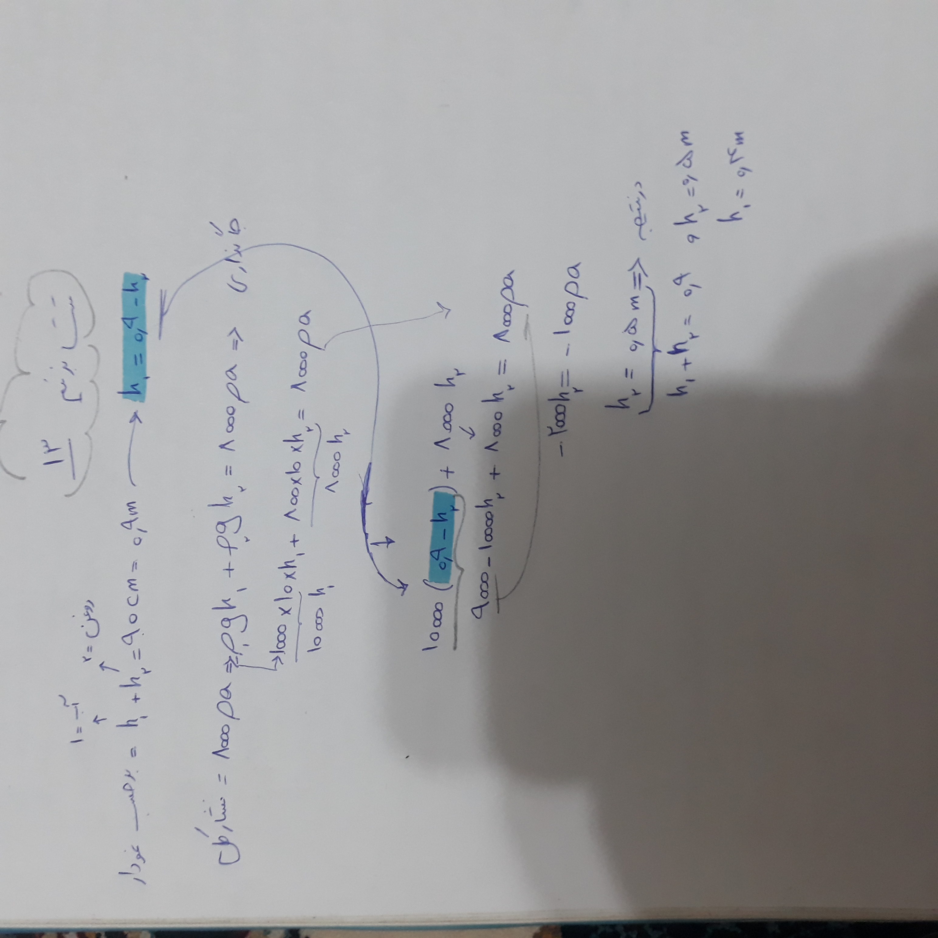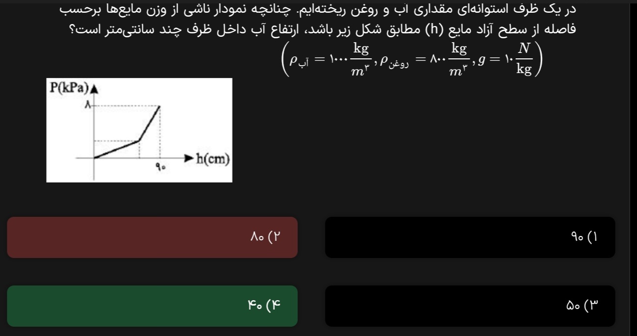 سلام شما میدونی اگر ارتفاع دو تا مایع با هم باشه ۹۰ سانتی متر، فشاری معادل ۸ پاسکال در ته ظرف ایجاد میشه حالا میای مینویسی که اگر در واقعیت ارتفاع اب اشه h1 و ارتفاع روغن باشه h2 فشار ناشی از این موارد رو محاسبه میکنی و برابر ۸ پاسکال میزاری زیرش مینویسی که محموع h1 و h2 باید بشه ۹۰ سانتی متر حالا یه دستگاه داری که باید حل بشه