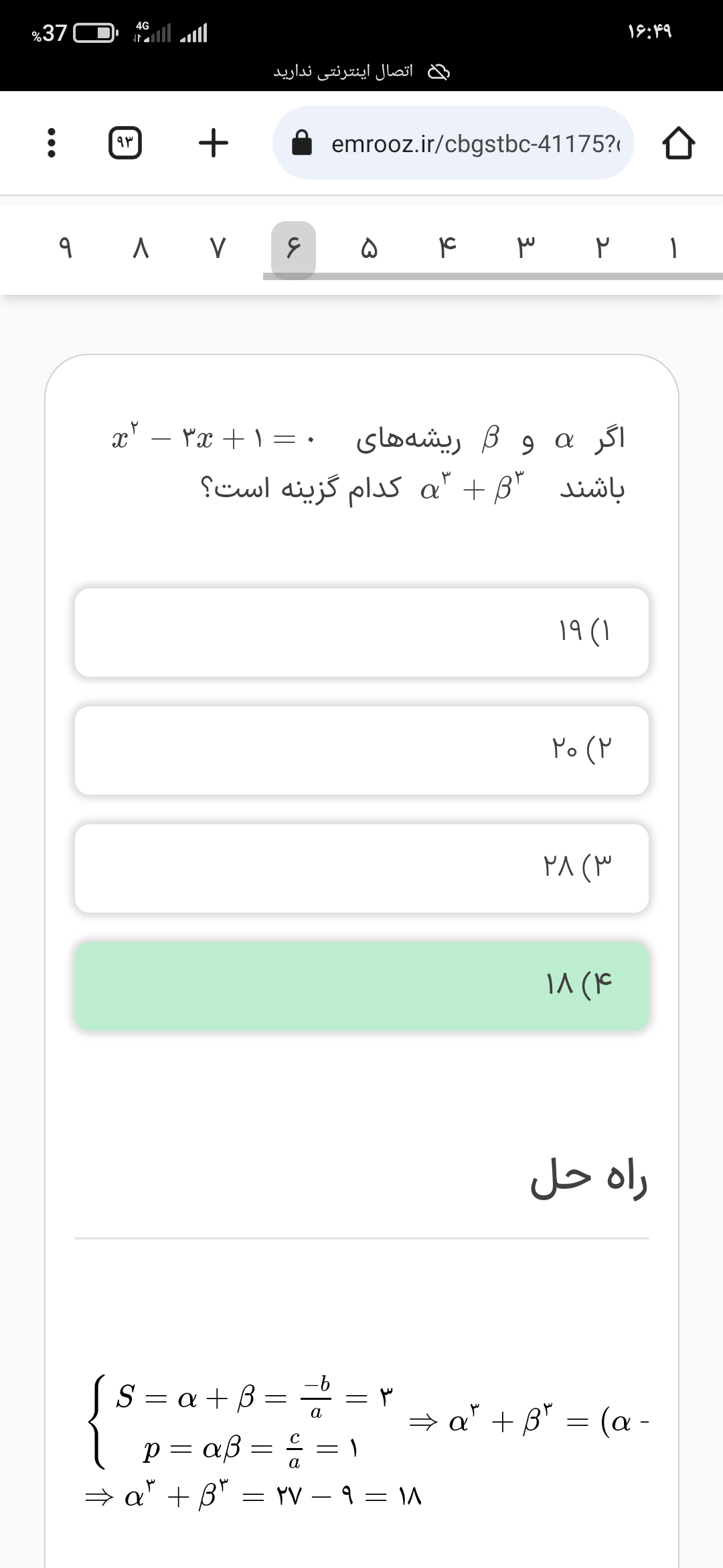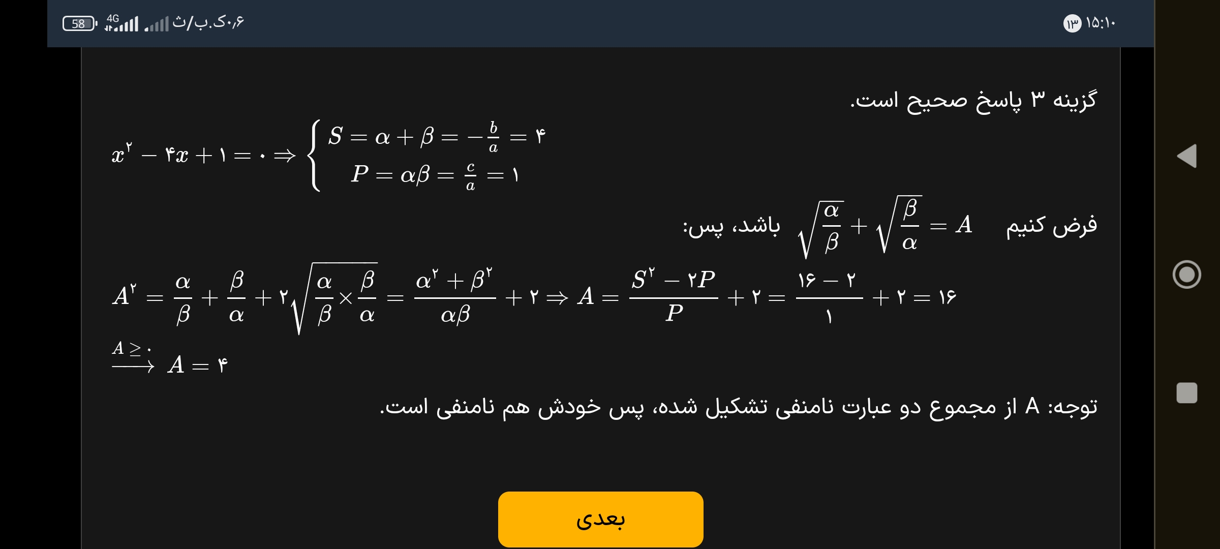 سلام و درود طبق راه حل ما اومدیم خواسته سوال رو A قرار دادیم و به توان دو رسوندیم طبق اتحاد مربع در به توان دو رسوندن یک پرانتز که در آن دو عدد جمع میشن، توان دو عدد اول به علاوه توان دو عدد دوم به علاوه دو برابر حاصل ضرب اون دو عدد رو خواهیم داشت اون عدد ۲ که شما میگی هم دقیقا اون عبارت سوم هست یعنی دو عبارتی که توی پرانتز بودن در هم ضرب شدن که شد ۱ و در دو هم ضرب شد که شد ۲