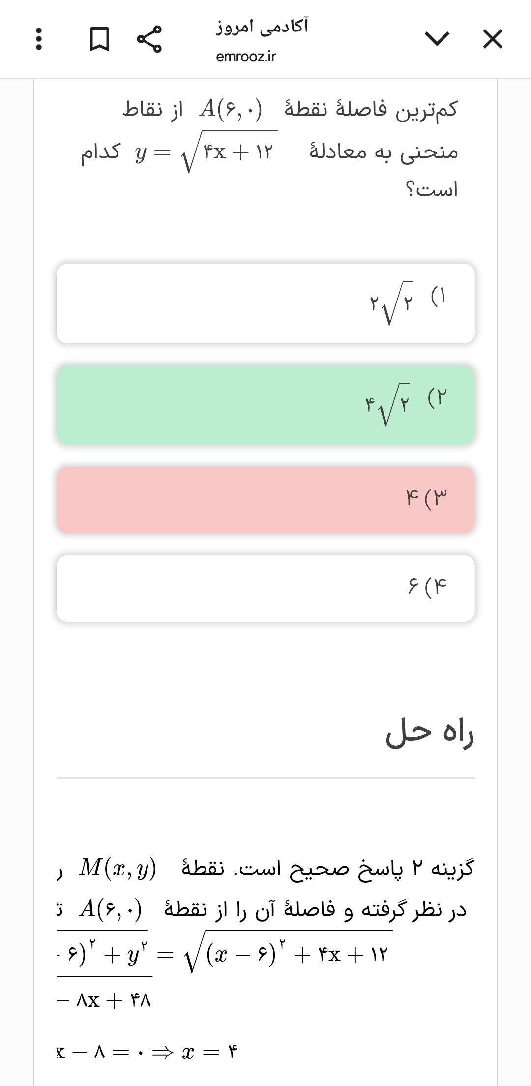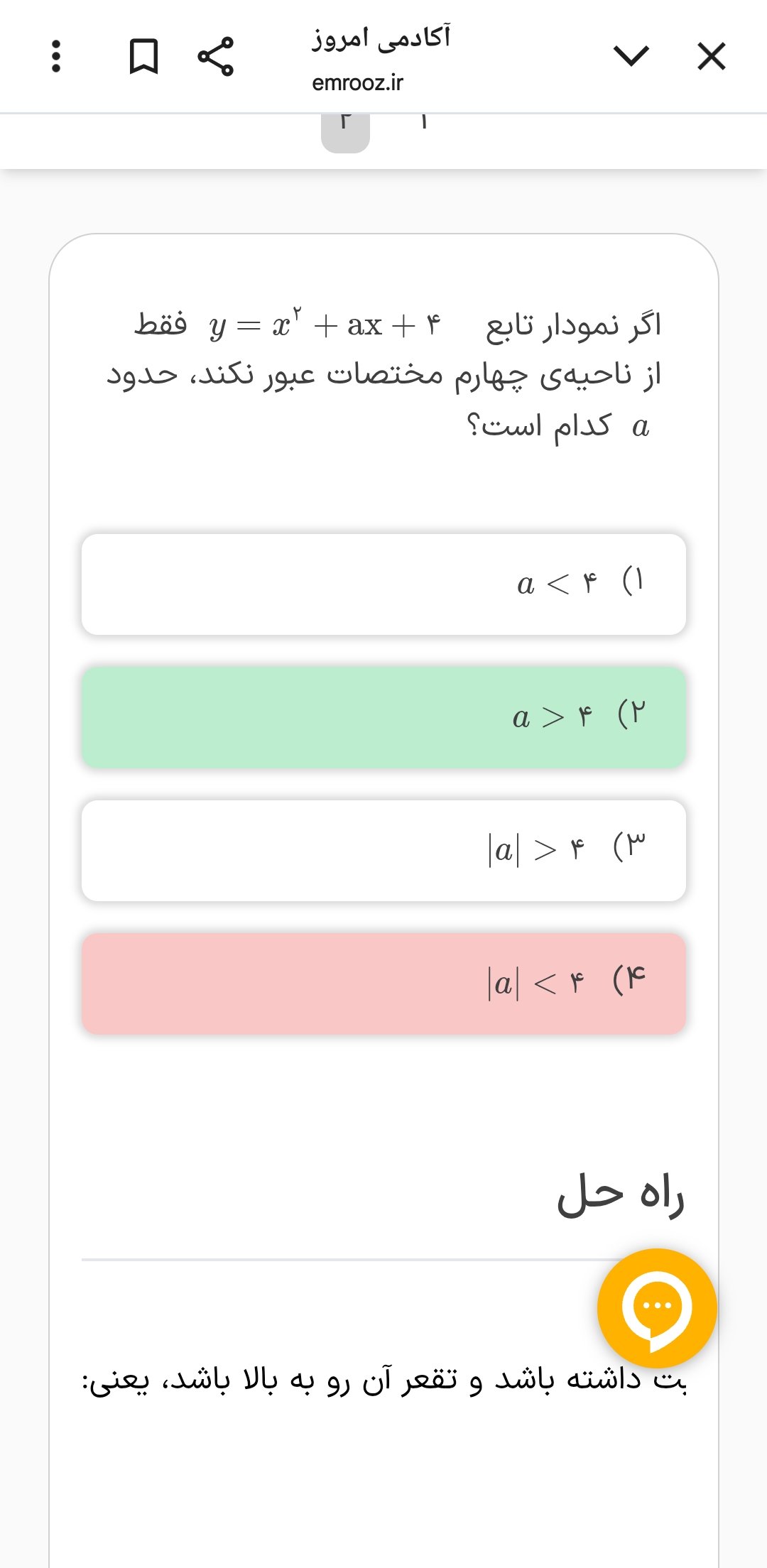 مثلاً یکبار a رو بذار ۵ که در گزینه دو و سه هست اما در گزینه یک و چهار نیست بعد بیا a رو جای‌گذاری کن و ببین از کدوم نواحی عبور می‌کنه میبینی که در این حالت از ناحیه ۴ عبور می‌کنه پس عدد ۵ برای آ قابل قبوله گزینه یک و چهار رد میشه حالا بین گزینه دو و سه یه عددی انتخاب میکنیم که بینشون مشترک نباشه مثلا ۵ـ که میبینیم در این حالت صدق نمیکنه پس گزینه سه هم رد میشه و فقط گزینه دو میمونه