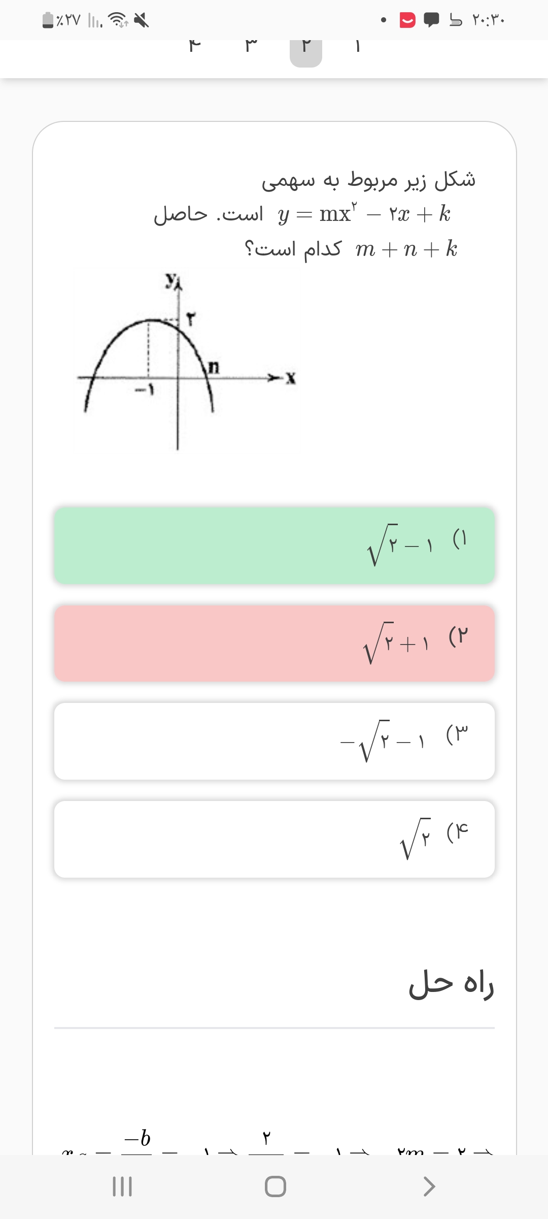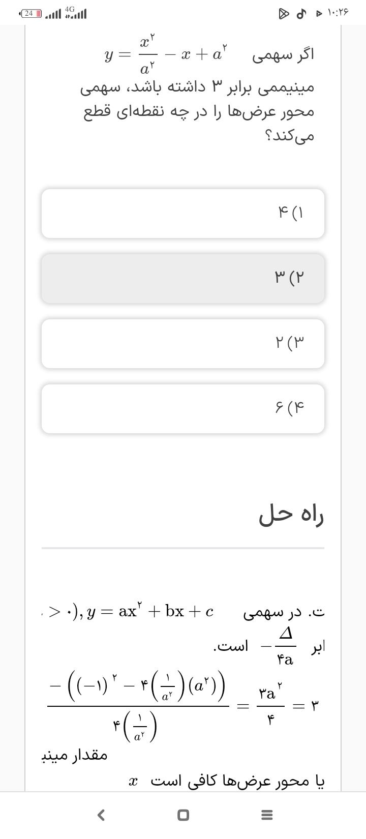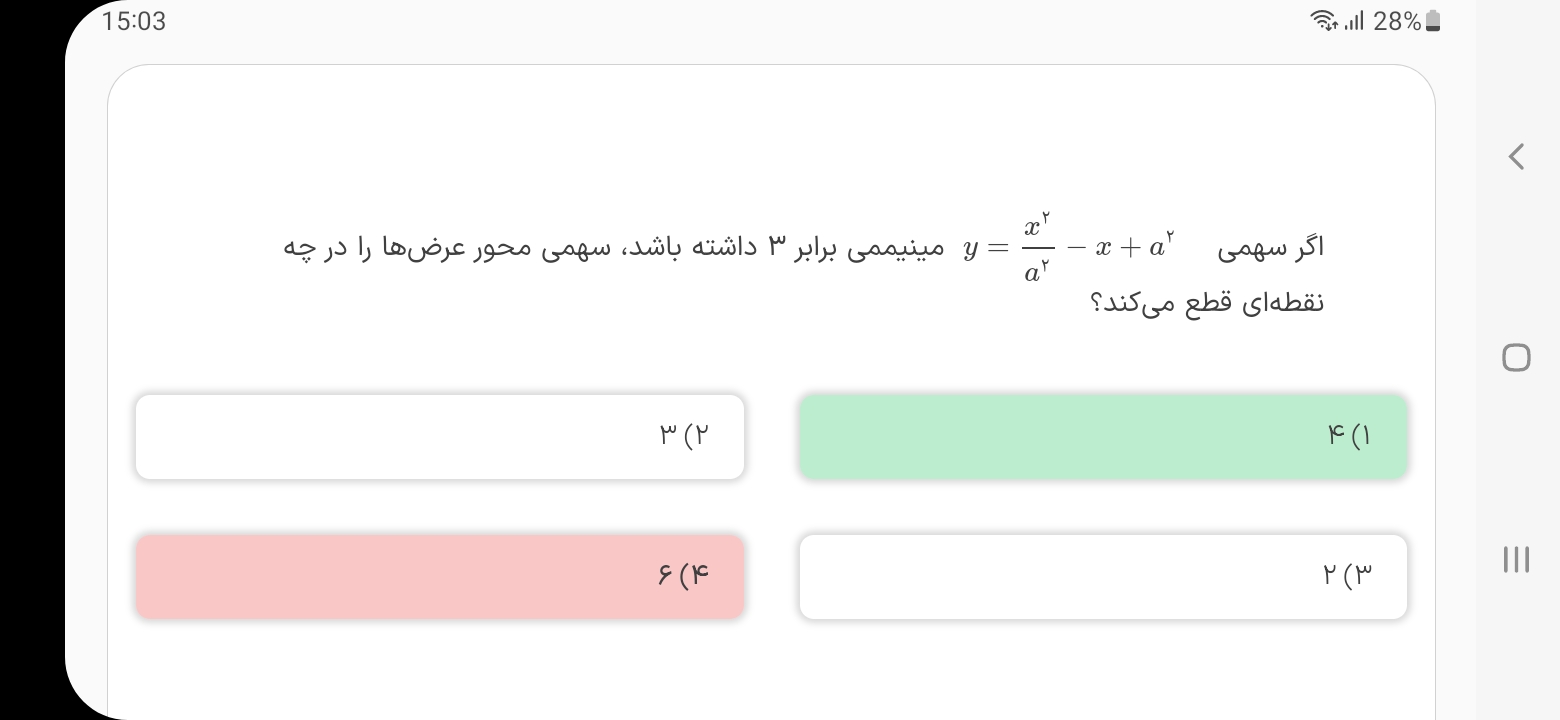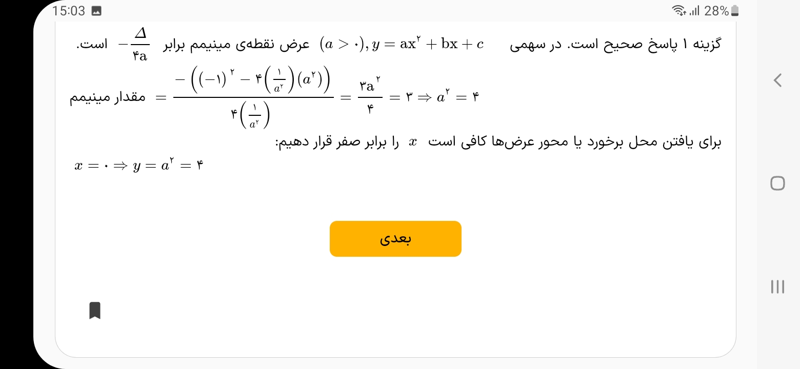 سلام توی تست هفتم جزوه که فیلمش در بخش مینی دوره ها گذاشته شده،(اینم لینکشhttps://emrooz.ir/courses/252/9123/65354) فک کنم استاد در حل تست اشتباه کردند !سوال مقدار b را نمیخواد بلکه مقدار abرا میخواد یعنی 8 که توی گزینه 3هست.درسته؟