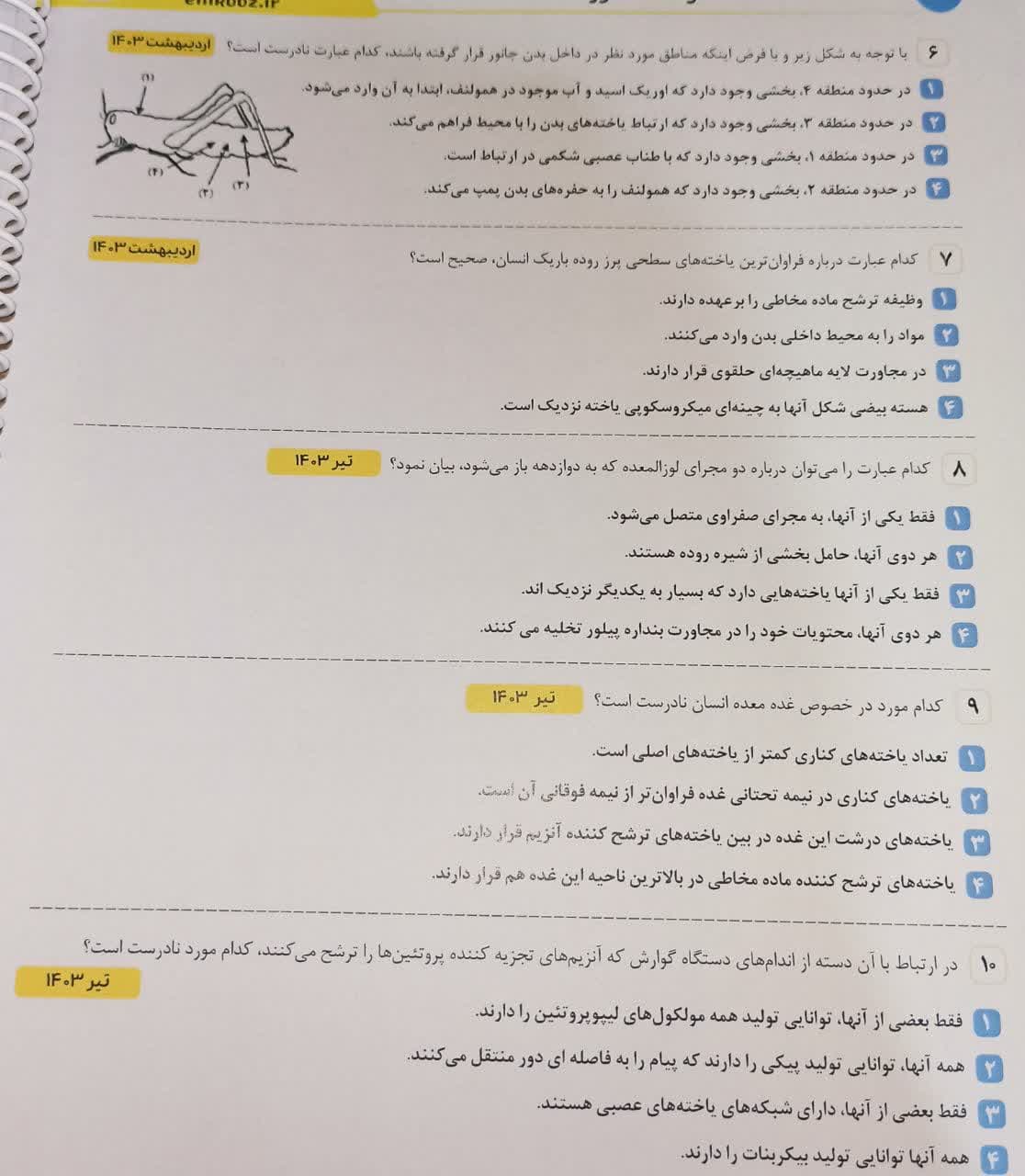 این صفحه وصفحه بعدی که میفرستم تستشون در جزوه هست ولی در ویدئوی تحلیلش نیست و استاد هیچ توضیحی درباره دستگاه گوارش ملخ و گاو و هیدر چیزی نگفتن