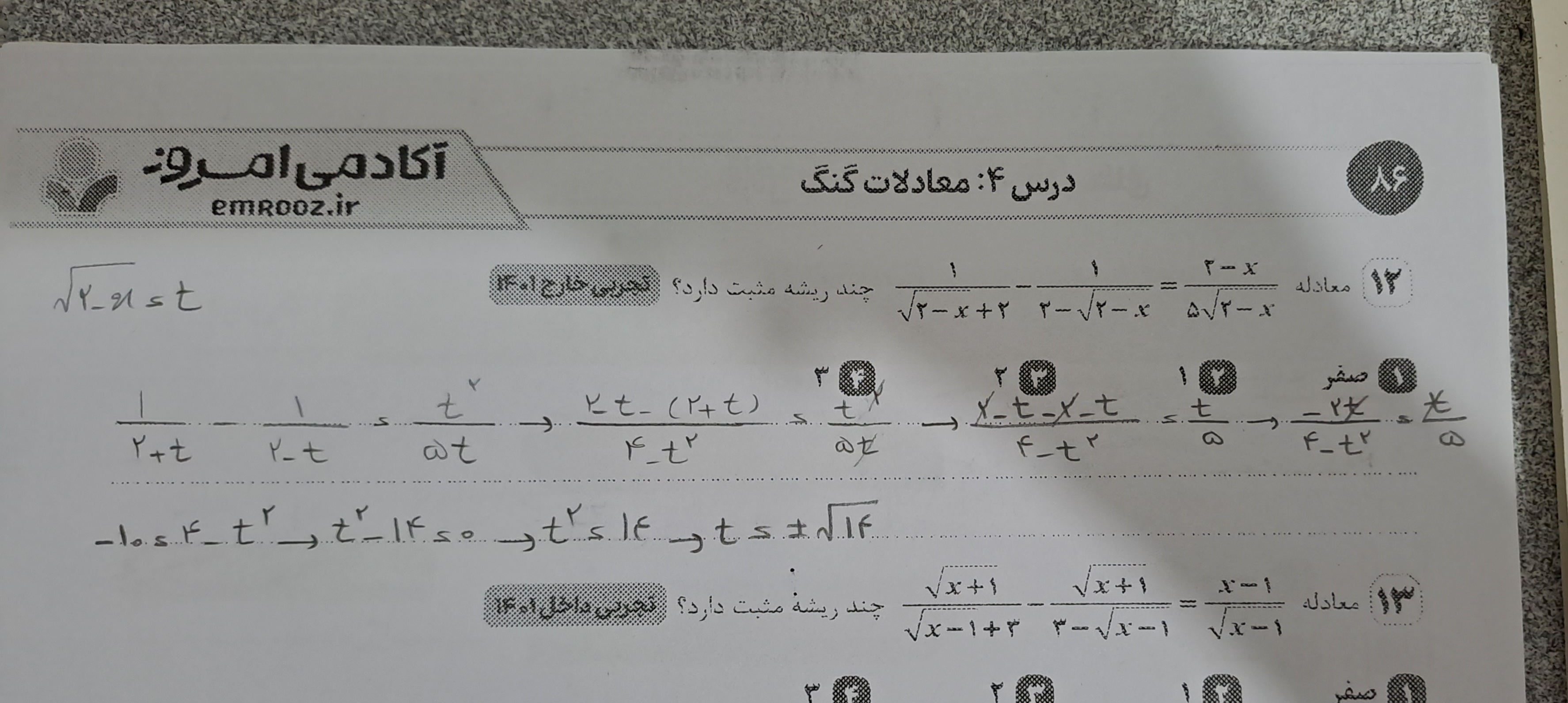 @ستاره امیری سلام فک کنم خانم رحیمی حواسشون نبود که اگه X بشه دو مخرج رو صفر میکنه و عبارت تعریف نشده میشه پس اون ایکس که شد ۲ قابل قبول نیست و فقط x مساوی منفی ۱۲ قابل قبوله که طبق خواسته سوال چون منفی ۱۲ ریشه ای مثبت نیست پس جواب سوال میشه صفر !