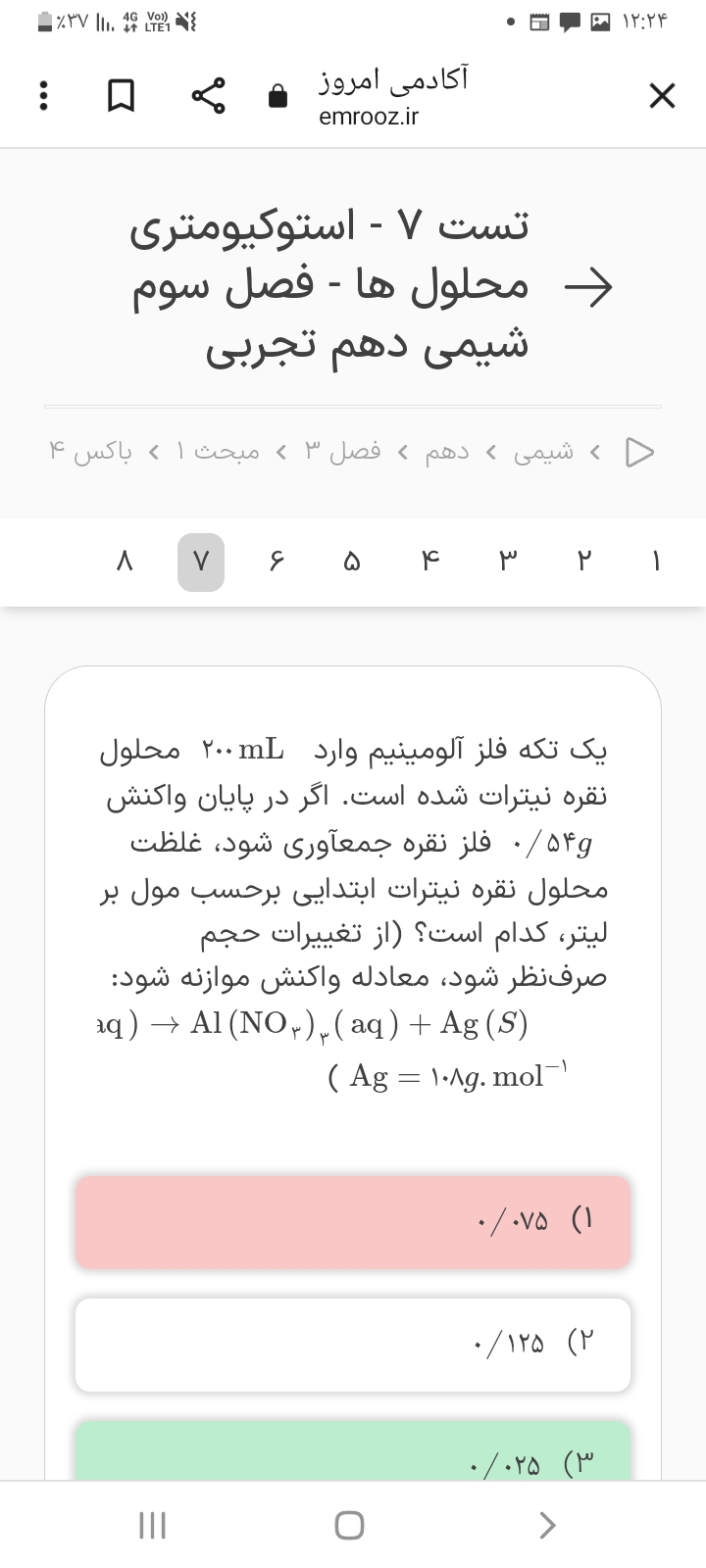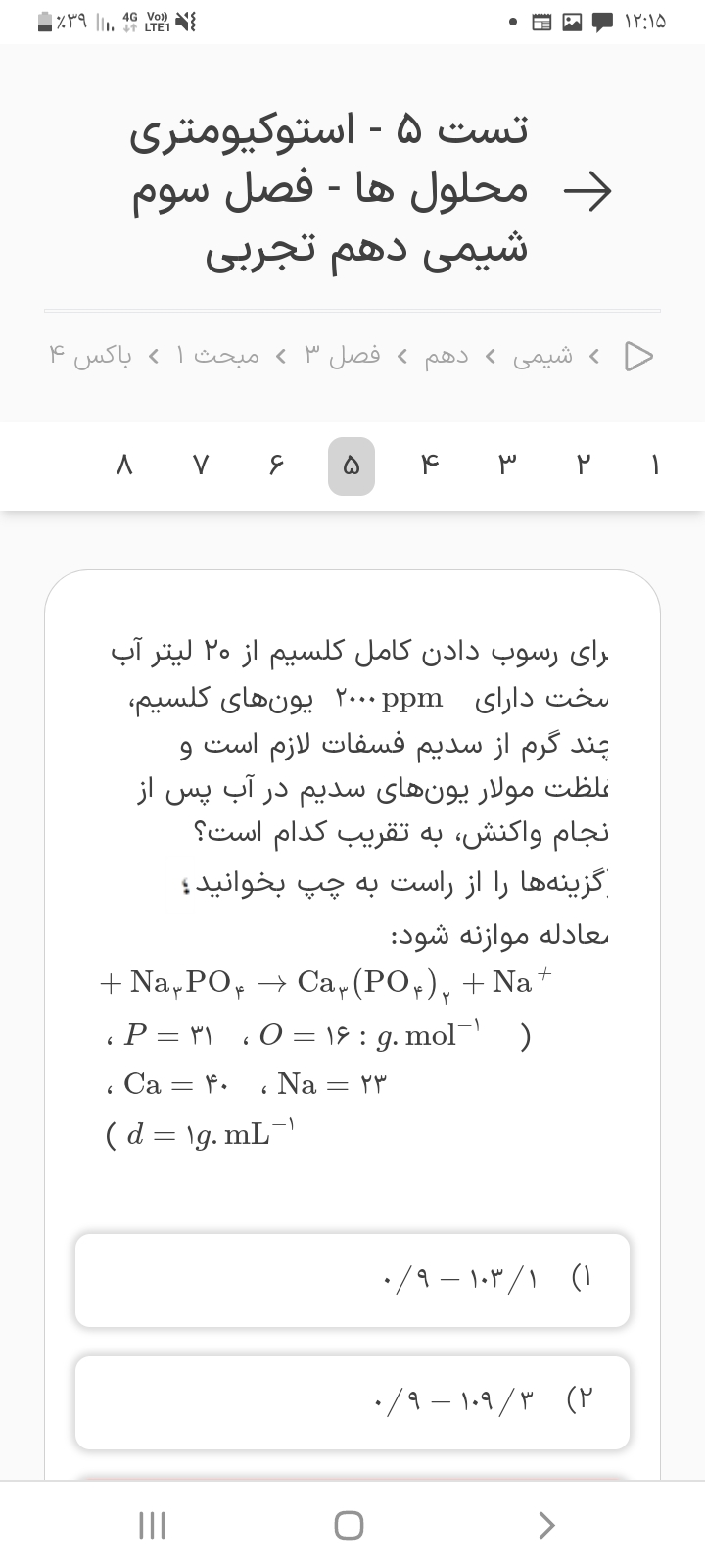 سلام دوستان لطفاً میکنین توضیح بدین؟ تست 2 - استوکیومتری محلول ها - فصل سوم شیمی دهم تجربی شیمی دهم فصل 3 مبحث 1 باکس 4 1 2 3 4 5 6 7 8 ۲L محلول نقره نیترات ۰/۲ مولار را با ١۰L محلول ۰/۰۳ مولار آن مخلوط کرده و در نهایت ۲kg آب خالص به آن‌ها اضافه می‌کنیم. اگر به محلول نهایی مقدار کافی آب دریا که شامل یون‌های کلرید است، اضافه کنیم، چند گرم رسوب تشکیل می‌شود؟ (فرض کنید که یون‌های نقره فقط با یون‌های کلرید واکنش می‌دهد.) (Ag=١۰۸,Cl=۳۵/۵:g.mol−١) 1) ۷١/۷۵ 2) ١۰۰/۴۵ 3) ۶۰/۲۷ 4) ١١۴/۸۰