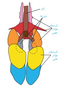 سلام ببخشید کیسه هوایی که منفرد است در واقع شش روی ان قرار دارد یا زیر ان ؟؟ چون توشکل قسمت بالایی رو نکشیده
