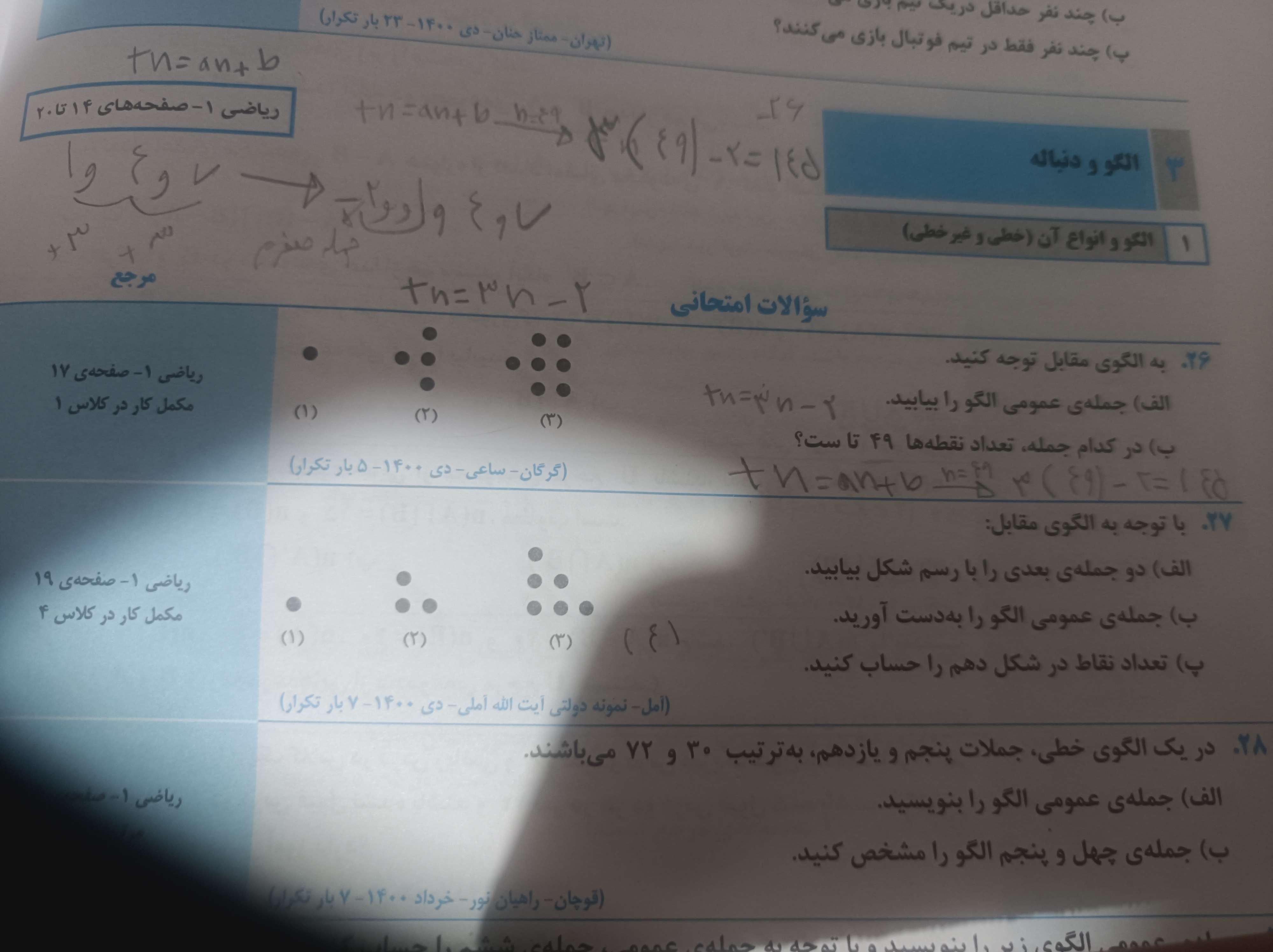 نباید 49 رو بجای n بزاری ! باید سه n منهای 2 رو مساوری 49 بزاری و معادله رو حل کنی تا n (همون شماره شکل) بدست بیاد !! جواب میشه 17 . یعنی تو شکل هفدهم ، 49 تا نقطه داریم (: