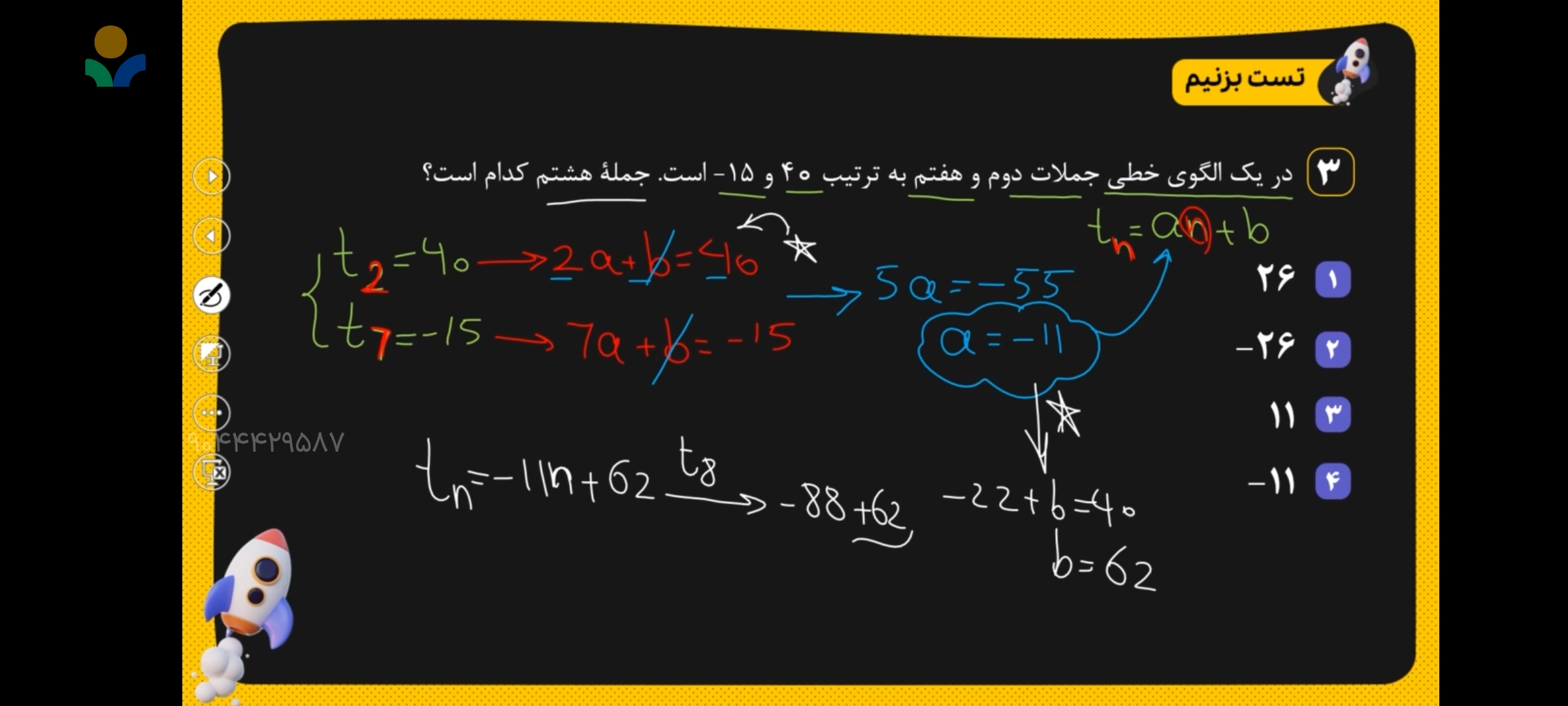 توی جمله عمومی که آخرش شد منفی یازده ان به علاوه ۶۲،چون جمله هشتم رو میخوایم،باید بجای ان جای‌گذاری کنیم هشت،که خب میشه منفی هشتادو هشت که اگر با اون ۶۲ هم جمع بشه،جمله هشتم بدست میاد منفی ۲۶