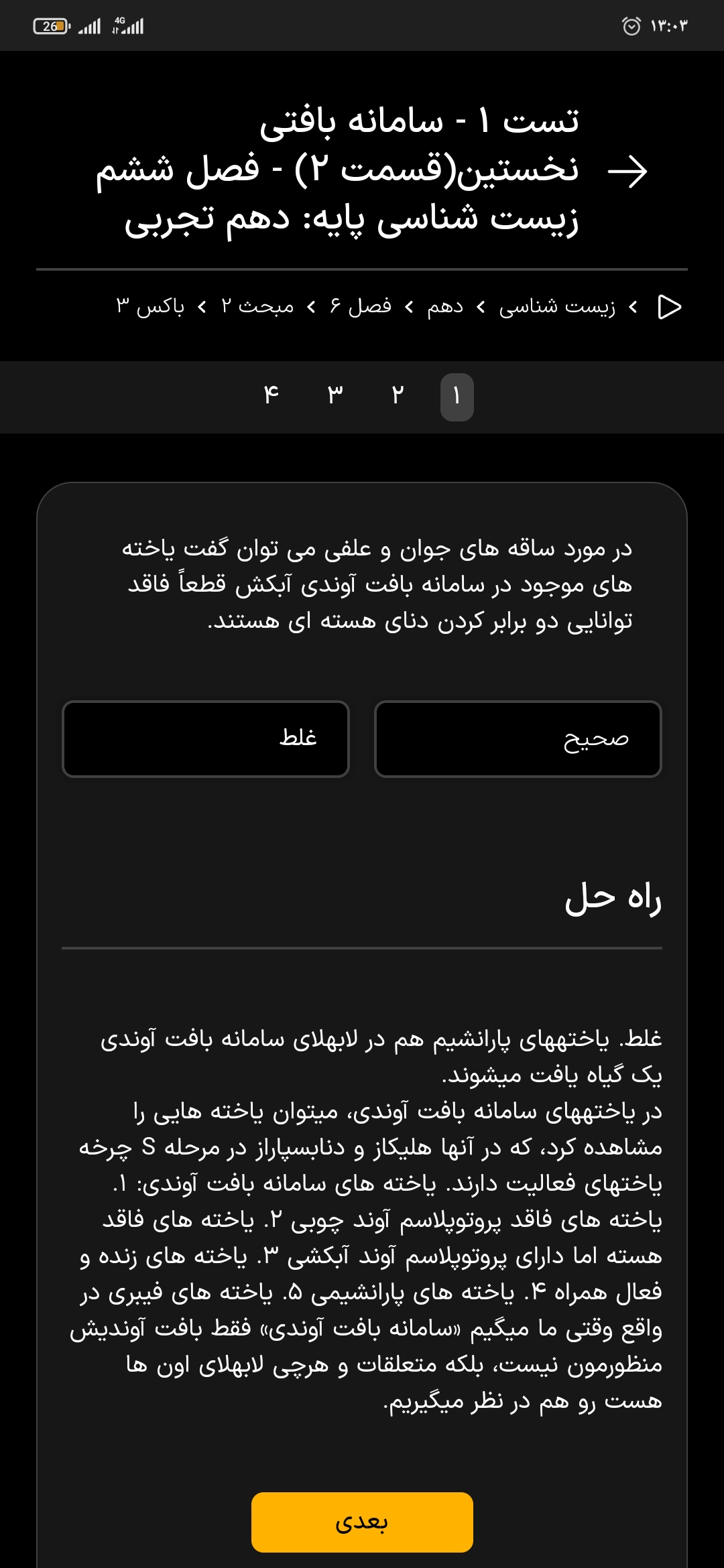 سلام الان سوال درباره پارانشیم و فیبر و ما باید گزینه ای رو در نظر بگیریم که راجع به هیچکدوم صدق نمیکنه؟ پس گزینه یک چی شد؟؟