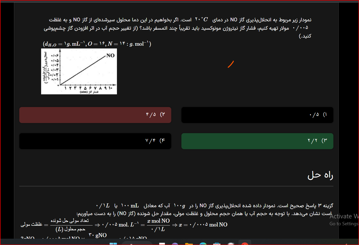 تحلیل استاد در مورد گزینه ج نامعلوم بود در واقع. تحلیل صحیح میشه کربن دی اکسید که با وجود ناقطبی بودن انحلال پذیریش از نیتروژن مونو اکسید که قطبیه بیشتره و این گزینه رد میشه