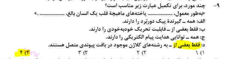 نگرش کنکور اخیر بنظر اینطوره که به این "بعضی" ها به چشم "گروهی" نگاه می کنه... در کنکور دی سوال 9 اینطور بود. کلید سنجش اومده هر 4 مورد رو درست گرفته که البته سر این خیلی بحث و جنجاله چون گزینه ج واقعا غلطه... ولی درمورد گزینه د توی کتاب دهم فصل قلب نوشته بود بسیاری... اینجا نوشته بعضی...اومده این بعضی رو درست گرفته...این نشون میده منظورش از بعضی "گروهی از" هستش...