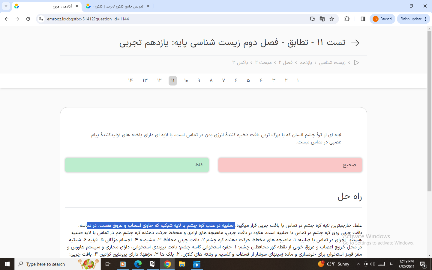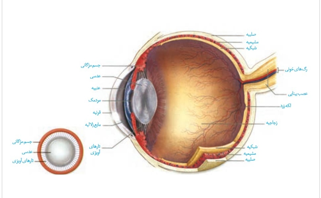 سلام. قسمت اول سوال که منظورش صلبیه هست. صلبیه، در قسمت عقبی چشم با یاخته های عصبی که از شبکیه میان در تماس هست