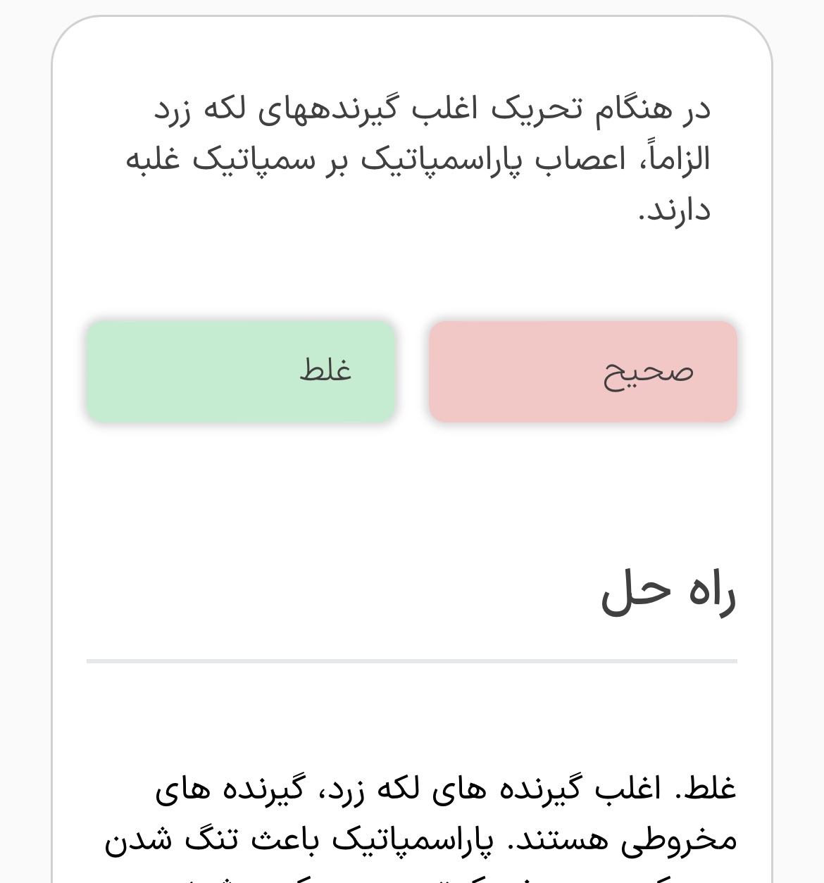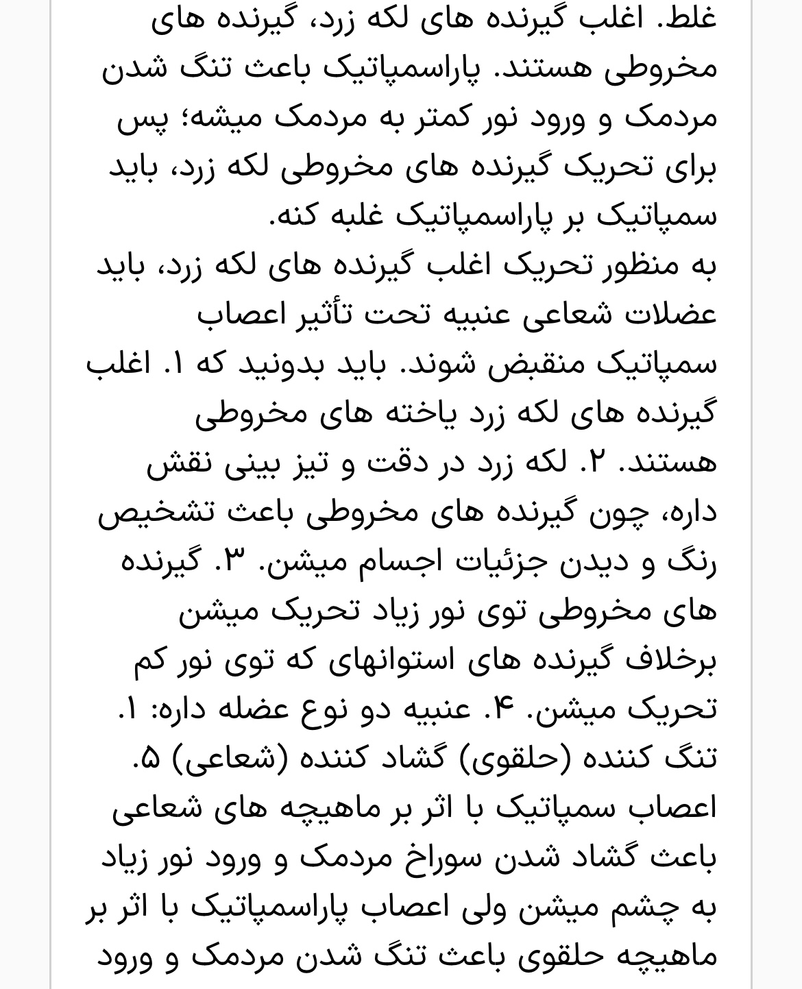 این سوال گزینه درست هست زیرا اغلب گیرنده های لکه زرد مخروطی هستند که در نور زیاد تحریک میشوند در این حالت مردمک باید تنگ شود چه کسی تنگ میکند پاراسمپاتیک؟؟درسته دوستان؟؟