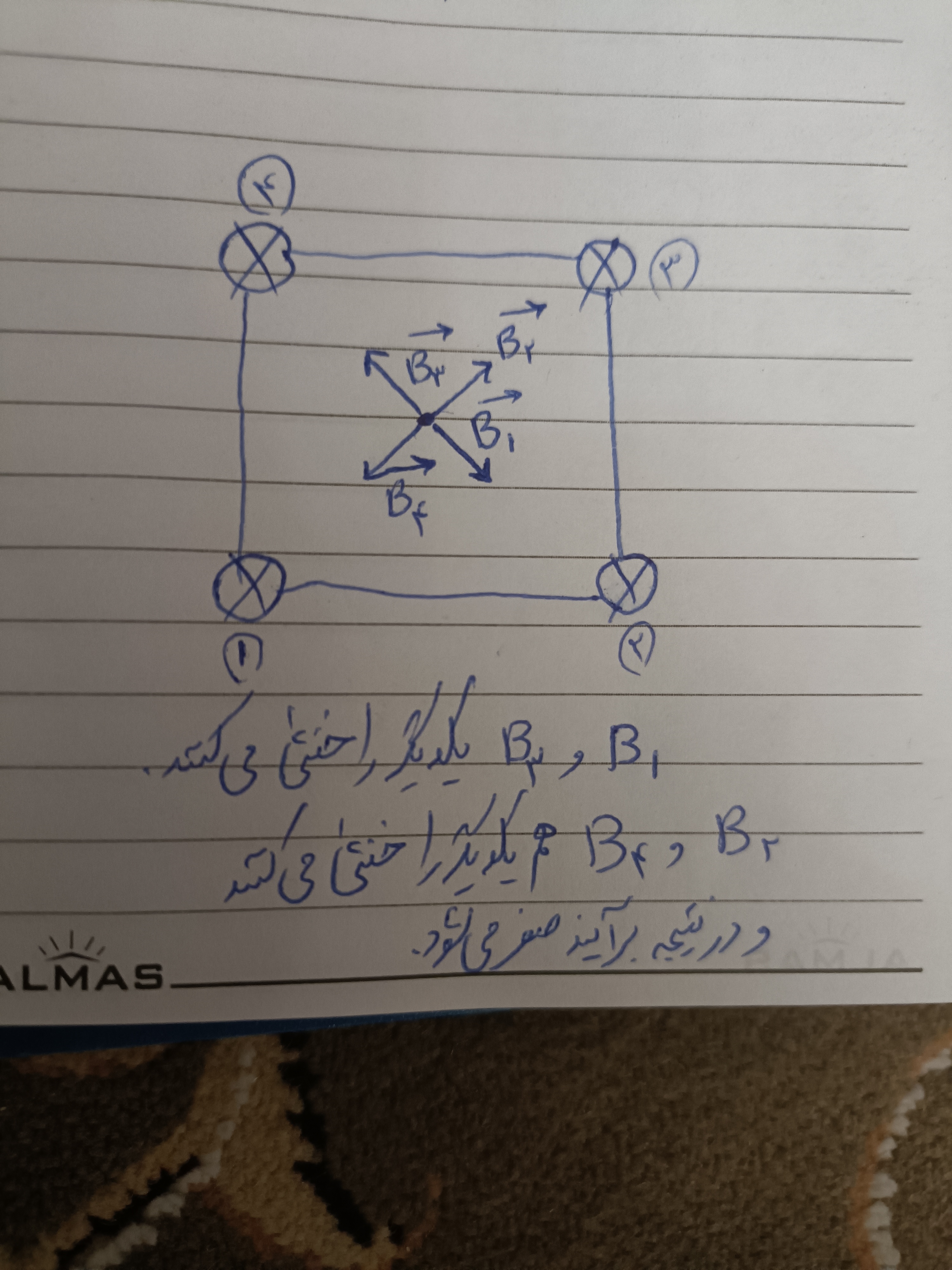 سلام روزتون بخیر برای این سوال نیازی نیست تک تک میدان های رو حساب کنیم چون ماکزیمم میدان رو داخل مربع میخوایم باید گزینه ای رو انتخاب کنیم که رو به رو ای ها همدیگرو خنثی نکنن از طرفی میدونیم اگر جهت جریان دو سیم هم جهت باشه میدان در نقطه وسطشون صفره وفقط گزینه 1 هست که جریان های رو به رو شبیه هم نیستن