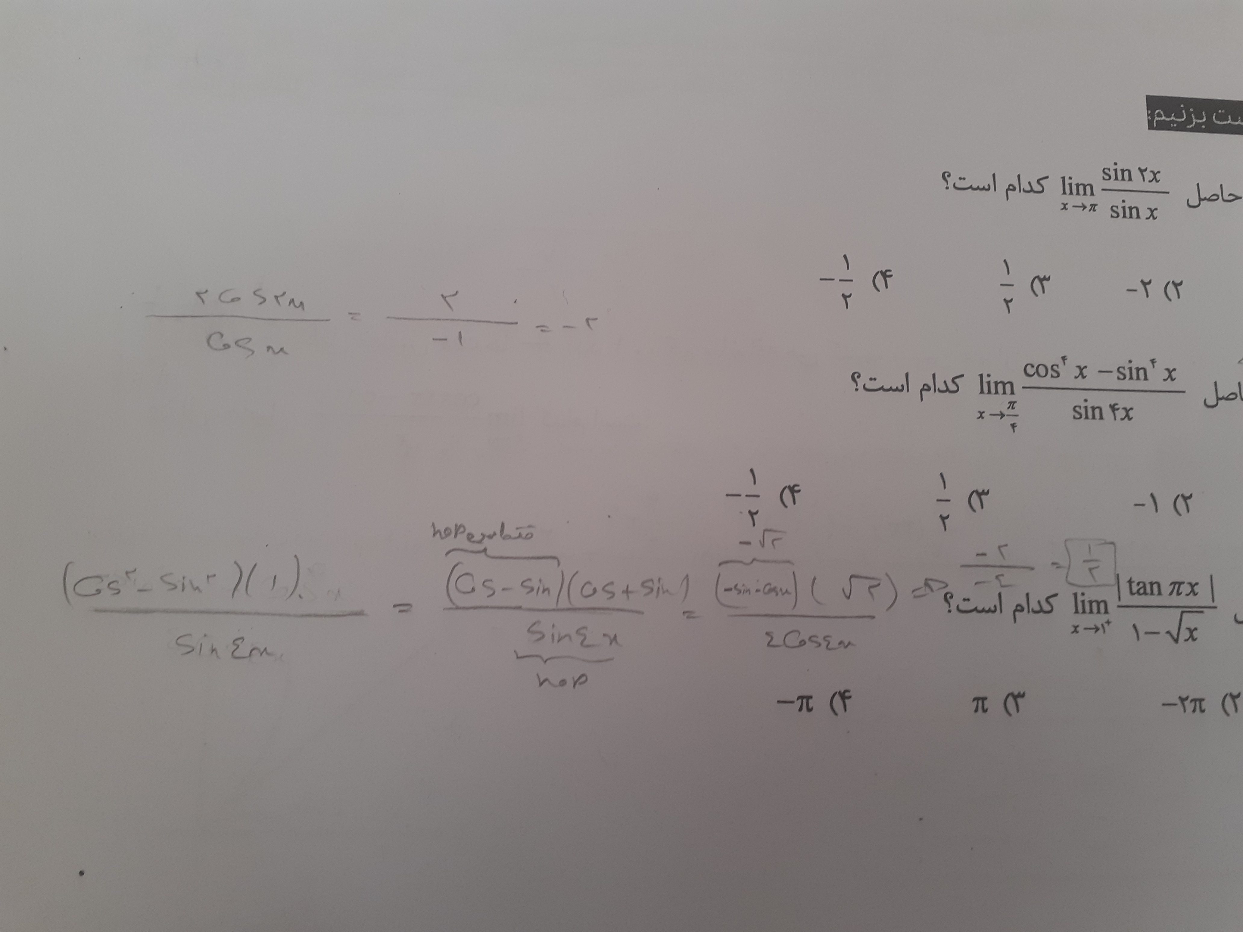 دایی فک کنم روش مشتق گیری مثلثاتی رو فقط باید در توابع مثلثاتی درجه ۱ انجام داد نمیدونم ولی من اول هم ارزی زدم تا عبارت صورت رو به عبارت های درجه یک تبدیل کنم.