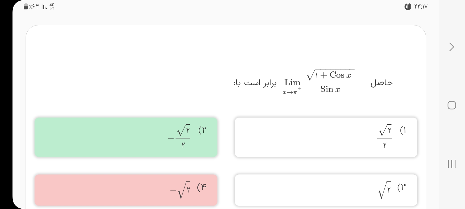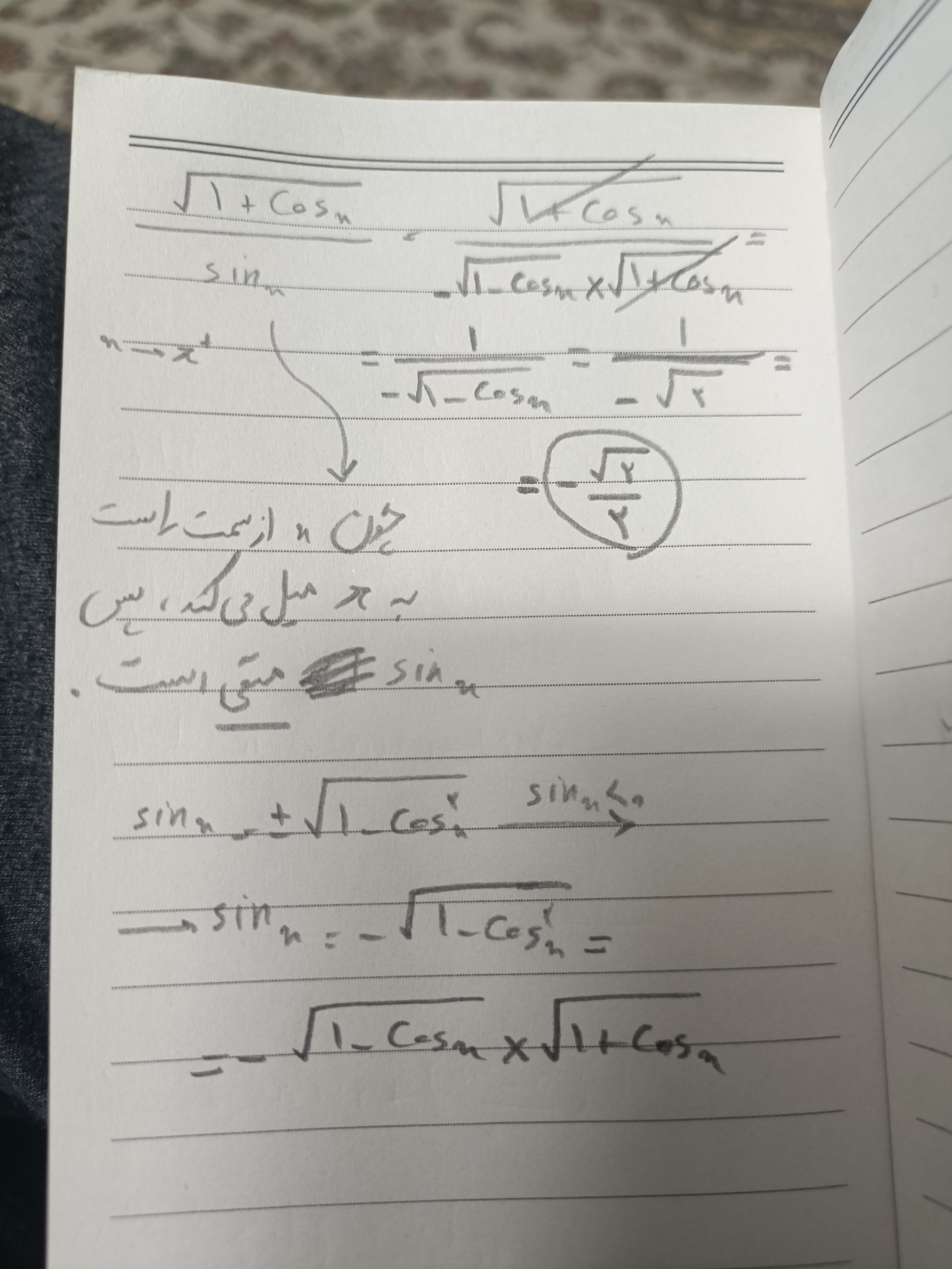 قسمت آخر سوال دور در دور نزدیک در نزدیک کردیم این کسر رو جواب شد یک به روی منفی رادیکال دو چرا همون اول ۲ رو ساده نکردیم که جواب به دست بیاد؟؟ (مثل شکل زیر)