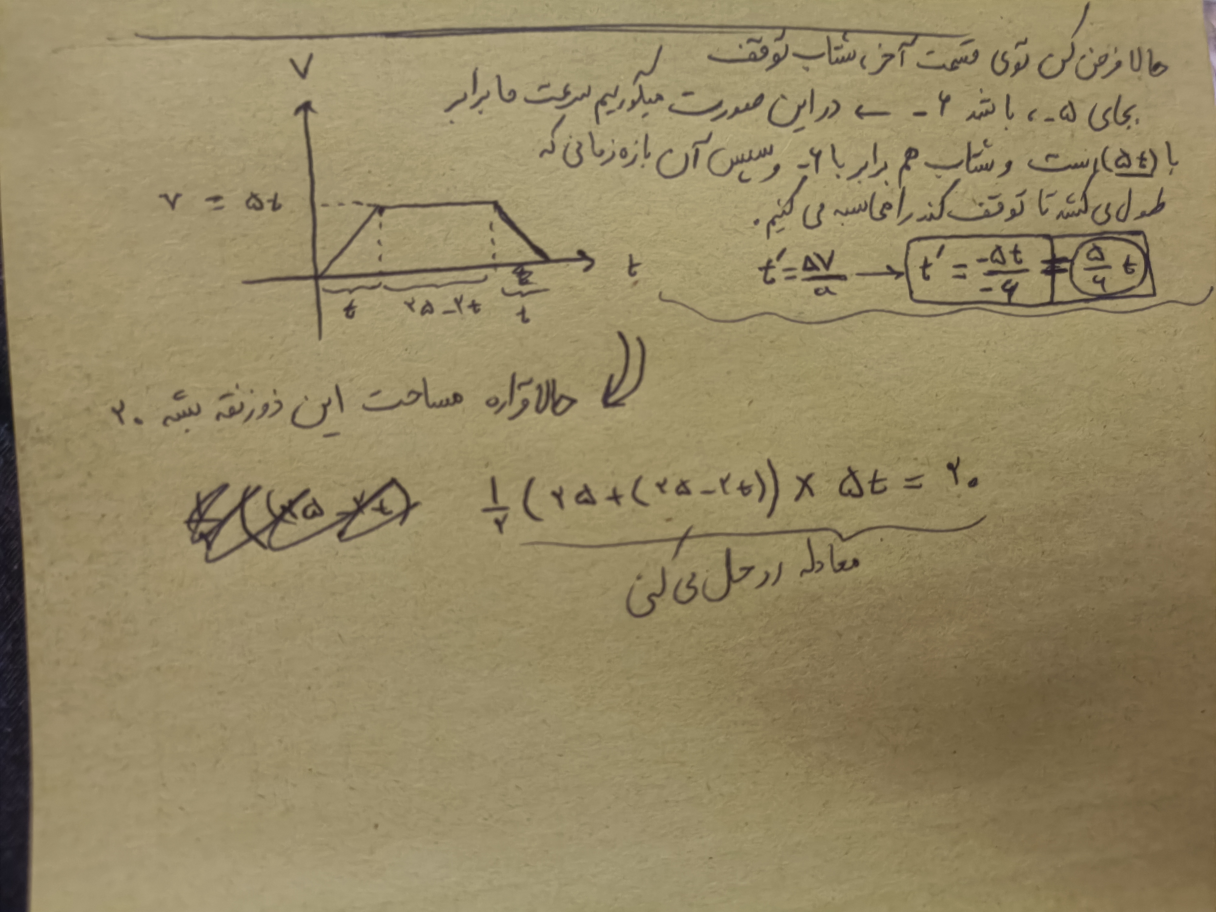 اینجا اگر ما نمودار شتاب زمان رو رسم کنیم با توجه به اطلاعات مسئله و سطح زیر نمودارش رو حساب کنیم و با سرعت متوسط برابر بگیریم درست در نمیاد چون سطح زیر نمودار شتاب زمان صفر میشه در صورتی که سرعت متوسط بیست هست