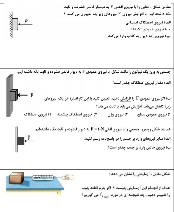 یک سوال در سوالاتی که یه جسمو چسبوندیم روی دیوار میتونیم بگیم عکس العمل نیروی وزن همون اصطکاکه؟ یا اینکه باید ببینیم جسم به کدوم سمت حرکت میکنه تا اصطکاک بشه خلاف جهتش؟ چون در این تیپ سوالا بیشتر جاها عکس العمل وزن هم جهت بوده با نیروی اصطکاک