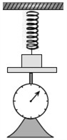 مطابق شکل مقابل، جسمی روی ترازویی قرار گرفته و فنری به ‌آن متصل شده است. اگر فنر به اندازهٔ ۴‏ سانتیمتر فشردهتر از طول عادی ‌آن باشد، ترازو عدد ۴۸ N و اگر فنر به اندازهٔ ۴‏ سانتیمتر کشیدهتر از طول عادی ‌آن باشد، ترازو عدد ۳۶ N را نشان خواهد داد. جرم جسم چند کیلوگرم است؟ (g = ١۰ Nkg)