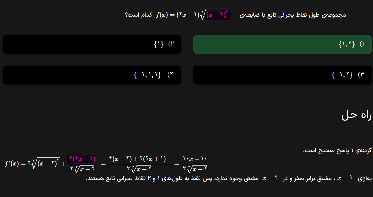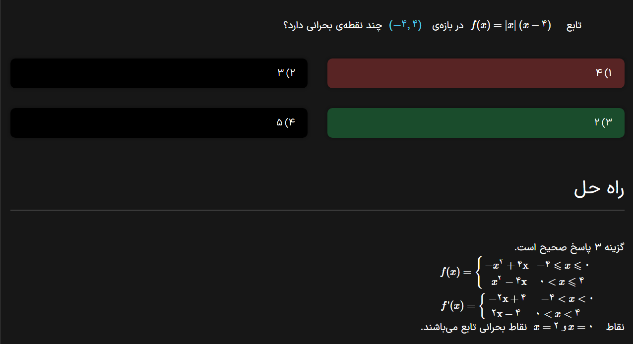 بعد این تست یک تست دیگه هم هست ولی ویدئوش نیست اگه هنوز اماده نیست پس بیزحمت جوابش رو بهم بدین سوال گفته ایکس در صورت و 1 منهای ایکس ضربدر قدر مطلق ایکس در مخرج چند تا نقطه بحرانی داره ؟