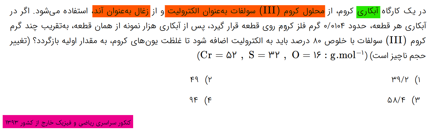 سلام وقت بخیر🙃 در ابکاری ی قاشق اهنی با فلز کروم نیم واکنش اکسایش و کاهش مربوط ب فلز کرومه و الکترولیتم کاتیونی از فلز کرومه دیگ درسته