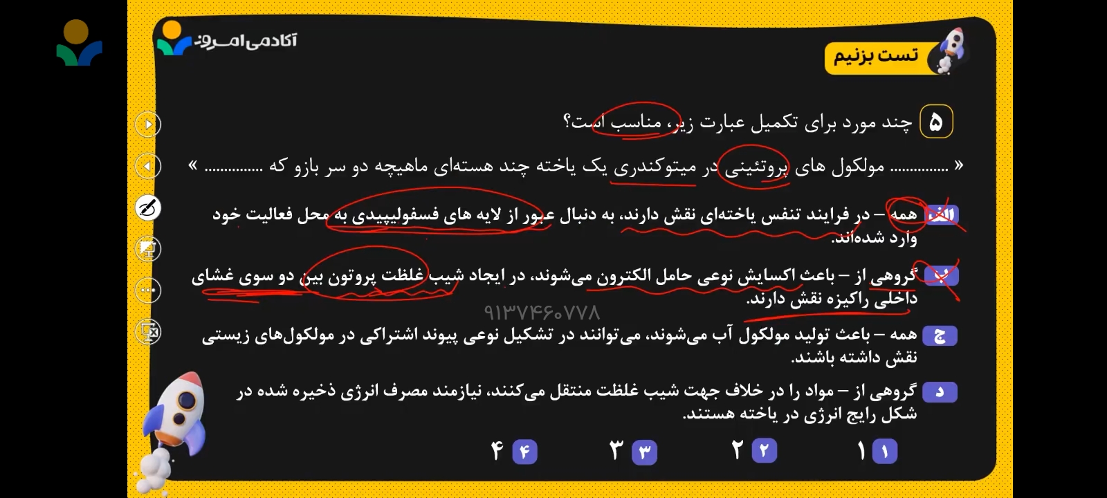 سلام وقت بخیر. برای مورد ج استاد دو مورد در نظر گرفتن : آنزیم ATP ساز در مرحله زنجیره انتقال الکترون و آنزیمی که در چرخه کربس ATP می سازه. یه مورد دیگه هم میشد در نظر گرفت...پمپ شماره 3 در زنجیره انتقال الکترون که الکترون رو می داد به اکسیژن و بعد با H مثبت ترکیب میشد و آب تولید میشد. درست میگم؟