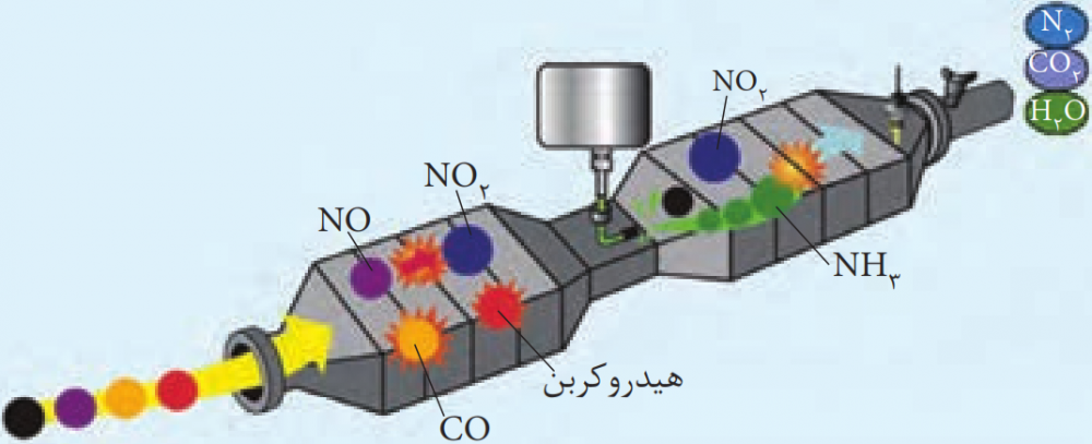 سلام وقت بخیر همان طور که در صفحه 164 جزوه توضیح داده شده N2 و CO2 و H2O خارج میشود. چون در خودرو های دیزلی NO و NO2 را نمیتوان به نیتروژن تبدیل کرد