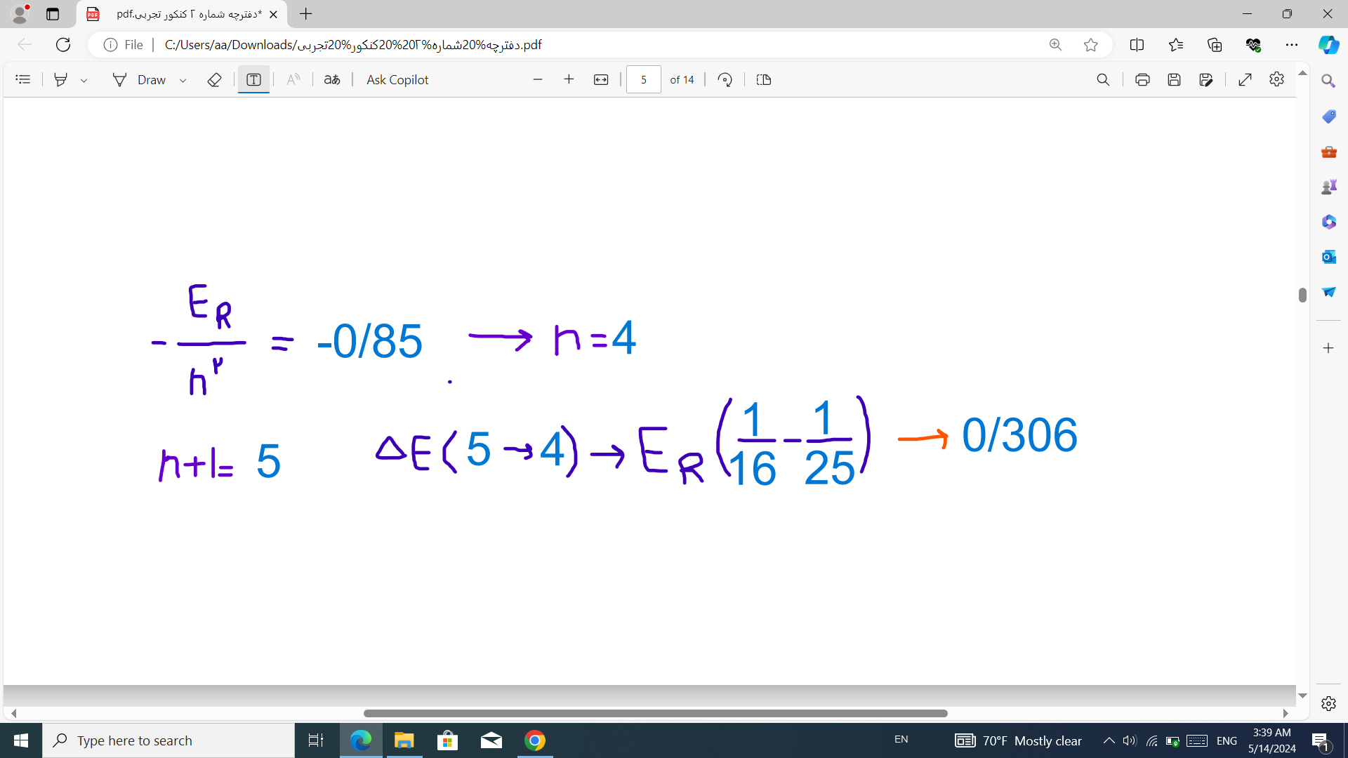 من خودم برای اینکه بفهمم توی n چند هست با اطلاعات قبلیم و ازمون خطا رفتم. تقریبا میدونستم n3 میشه ۱٫۵ گفتم احتمالا ۴ باشه . بعد گفتم انرژی تو حالت پایه هست ۱۳.۶ و اگه n مساوی ۴ باشه ( انرژی لایه ها با n نسبت عکس داره ) میشه ۱۳.۶ تقسیم بر ۱۶ . میشه ۰/۸۵ پس تو همین لایس . بعدش هم باید از ۴ به ۵ بره که مثل روال قبله