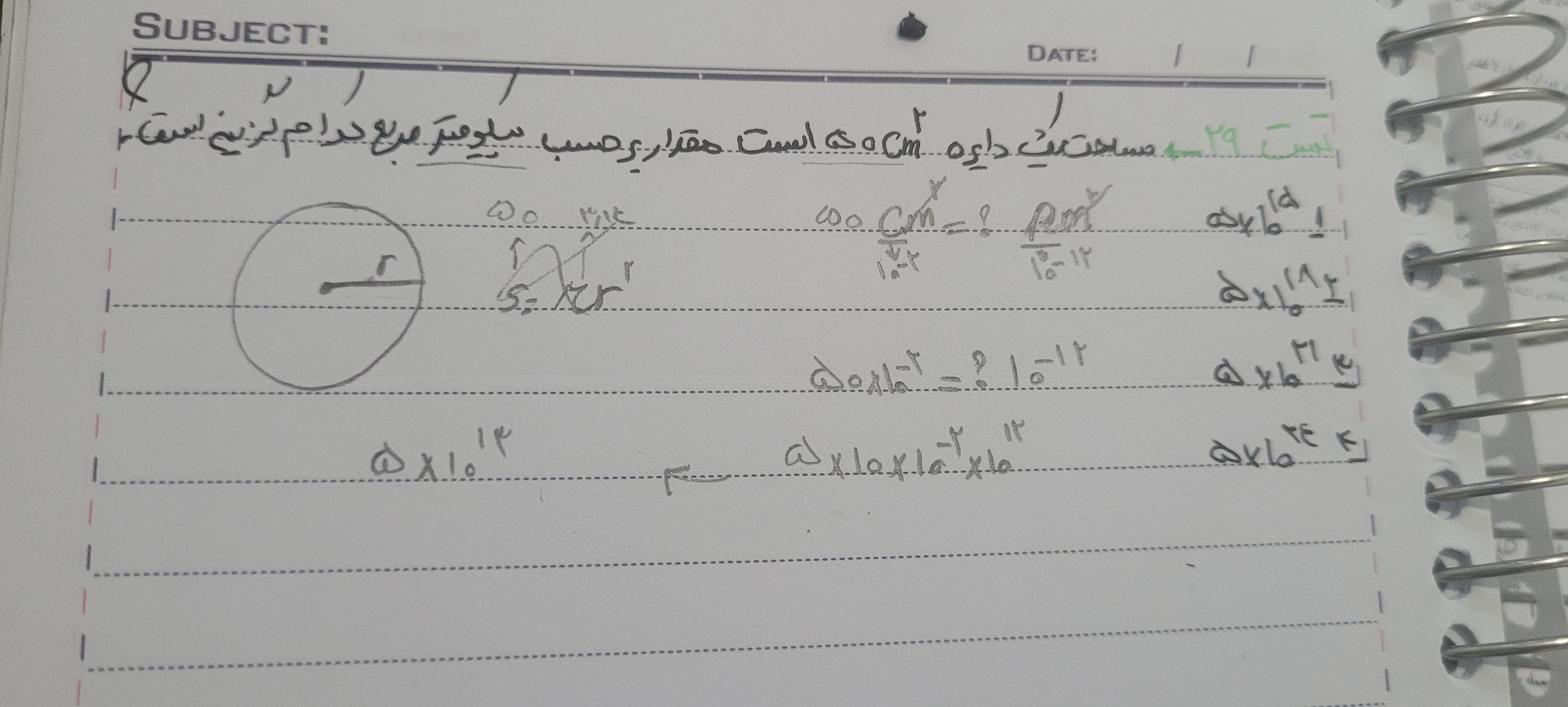 مساحت یک دایره 50 سانتی متر به توان دو این مقدار برحسب بیکو مترمربع بدست بیارید