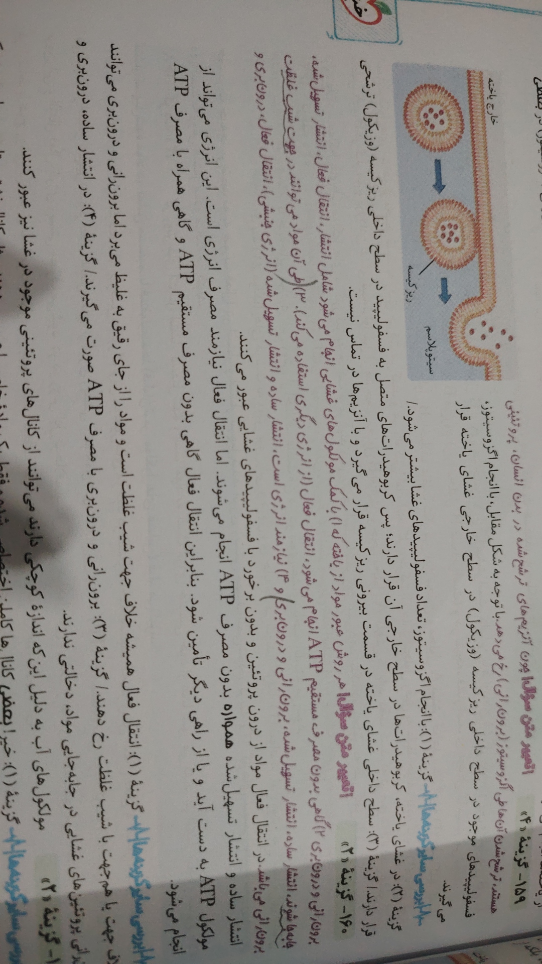 یه سوال سوال 160 و 164 فصل یک خیلی سبز دهم چرا باهم پارادوکس داره مگه وقتی سوال میگه موادی بر خلاف شیب غلظت یا هم جهت با شیب غلظت جابه جا می شود مگه نباید اندوسیتوز و اگزوسیتوز هم برسی کنیم به این خاطر که اوناهم ممکنه بر اساس نیاز یاخته هم جهت یا خلاف جهت با شیب غلظت باشن؟ پس چرا سوال 160 میگه اینطوریه ولی 164 نقضش میکنه سوال 164 هم سوال کنکور چهارصد و دو بوده؟
