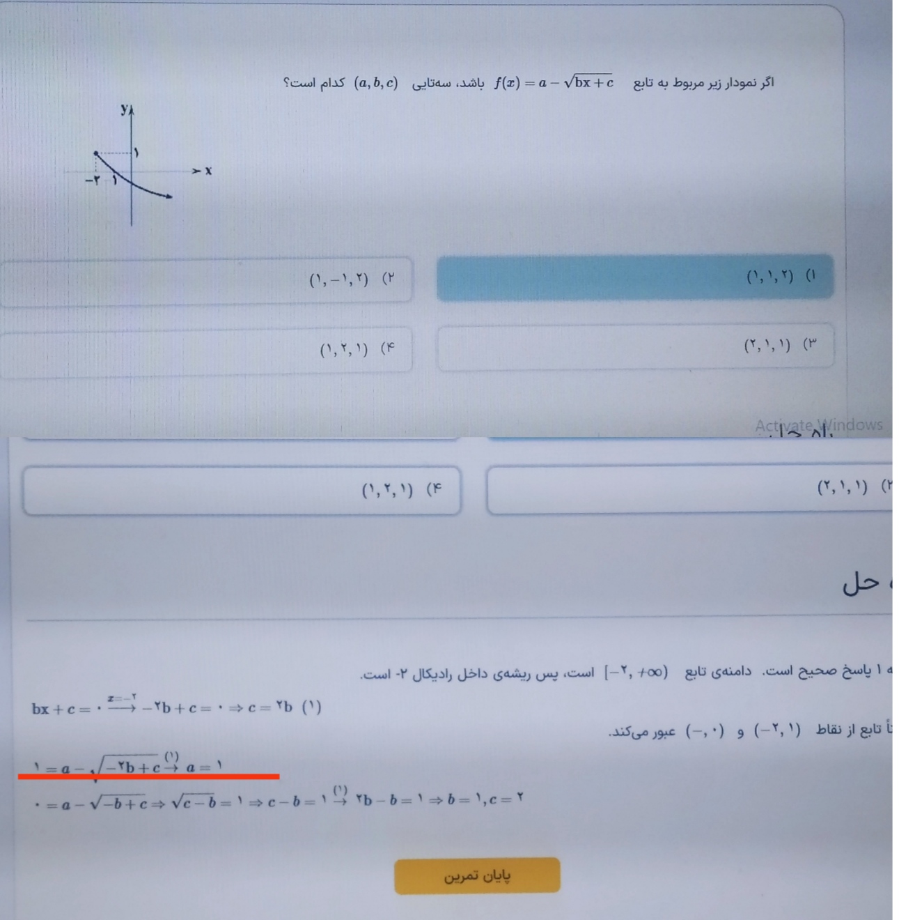 سلام و درود نقطه شروع نمودار ، ریشه عبارت زیر رادیکال است پس اگر bx+2 بشه صفر و بجای ایکس ما بذاریم منفی ۲، خواهیم داشت 2+ 2b- که ازینجا b میشه ۱